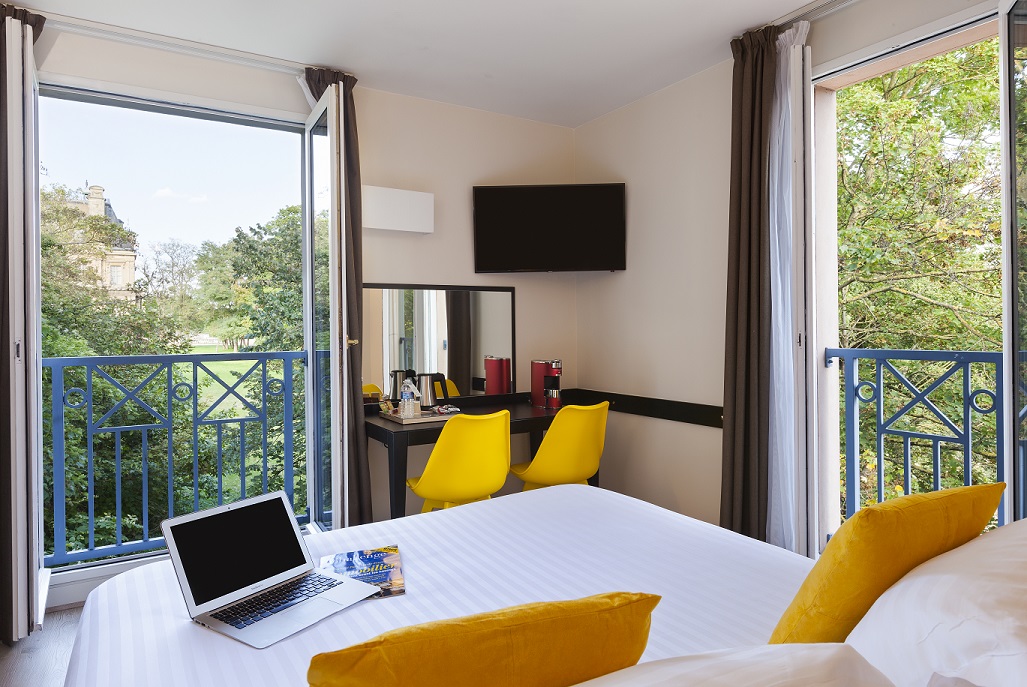 Cette situation idéale permet de profiter du cadre exceptionnel et historique de la ville, de ses restaurants, de son parc, de son château situé à 50 mètres de l’hôtel, de son hippodrome de galop, de sa proximité avec la Seine et de la forêt de Saint-Germain en laye.