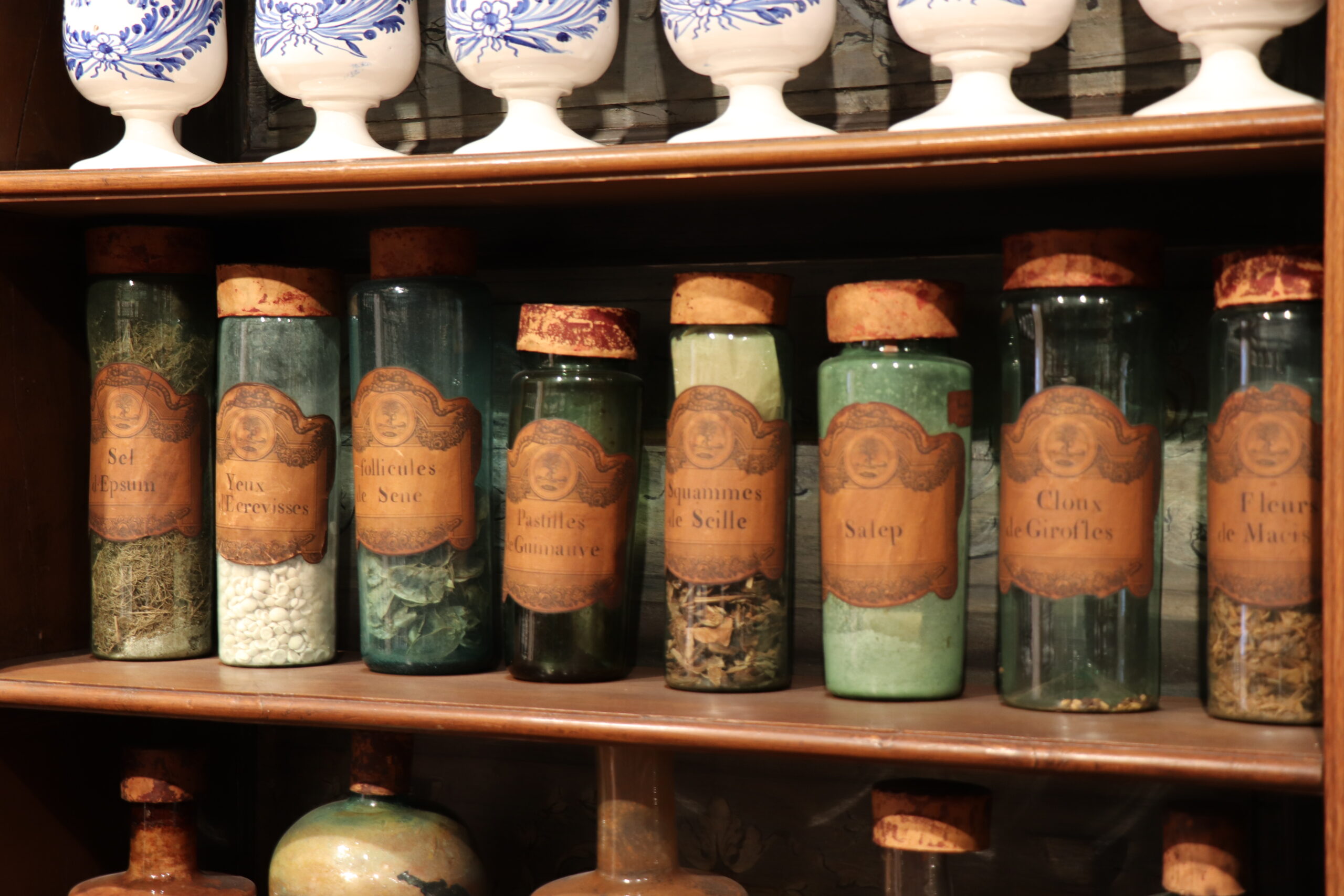 Elle évoque la médecine sous Louis XIV avec une collection de pots en faïence ornés de motifs bleus, de bocaux en verre et de boîtes à plantes médicinales décorées à la main. Tous ces objets datent des XVIIe et XVIIIe siècles et sont issus de l’Hôtel-Dieu, de la Charité et de l’Hôpital général fondés à Saint-Germain-en-Laye au XVIIe siècle.