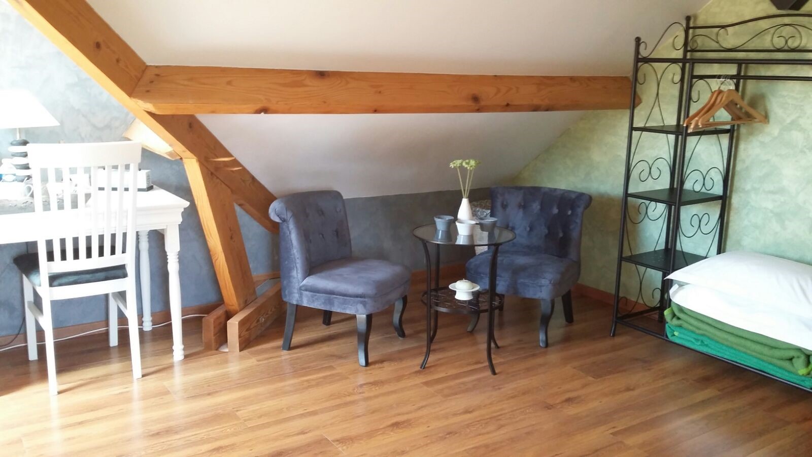 Chambre Marjolaine : À l'étage, cette chambre accueillante offre un lit de 160 cm et un lit de 90 cm, ainsi qu'un coin salon avec deux chaises. Sa salle de bains privative comprend une douche, une baignoire et des toilettes. Admirez la vue sur les champs depuis cette chambre non-fumeur.