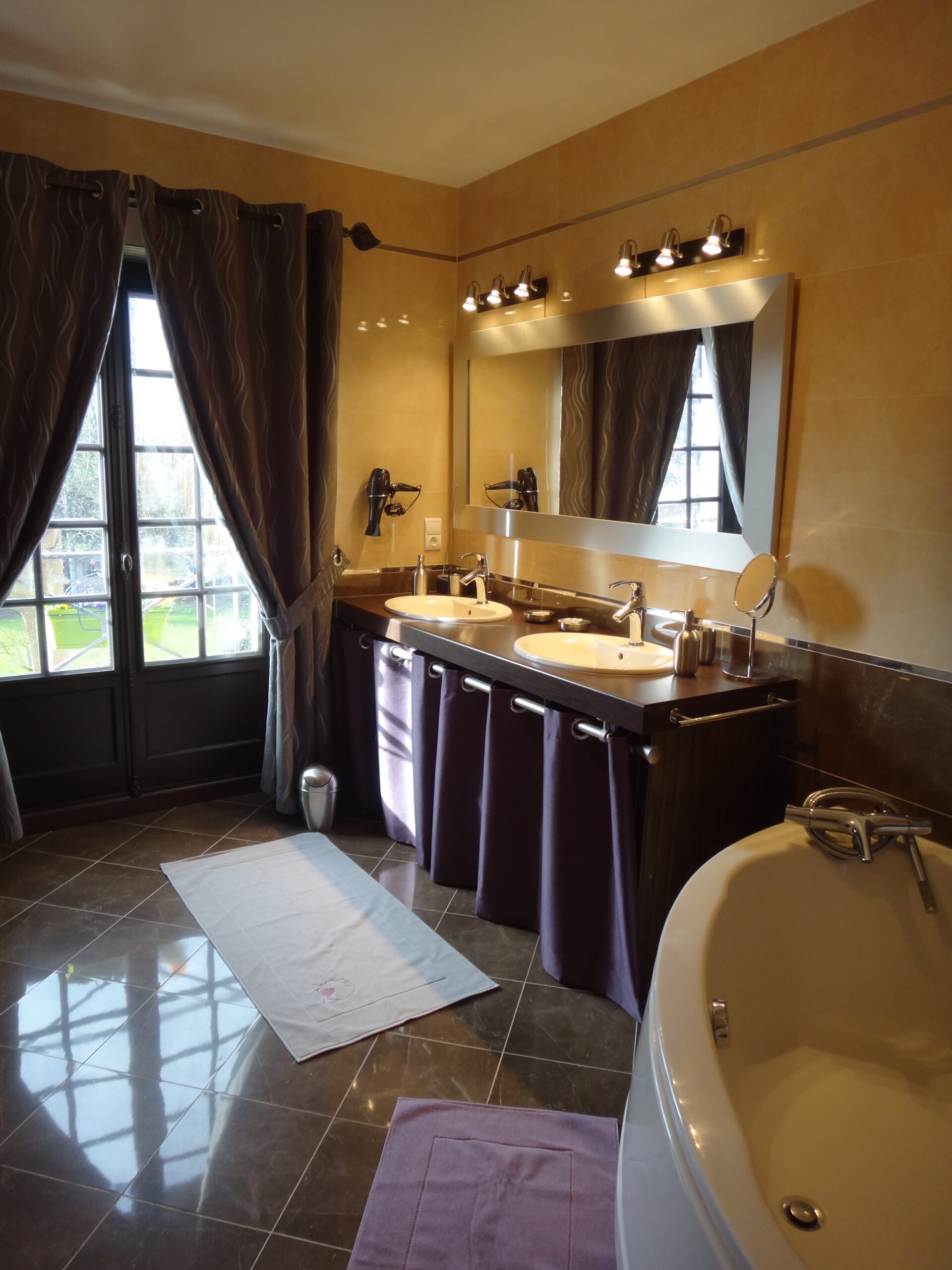 Suite Parentale "de Vilquoi", au rez de chaussée ,avec lit matrimonial, vaste salle de bains privative communicante et wc indépendants et privatifs. Vues sur le jardin.