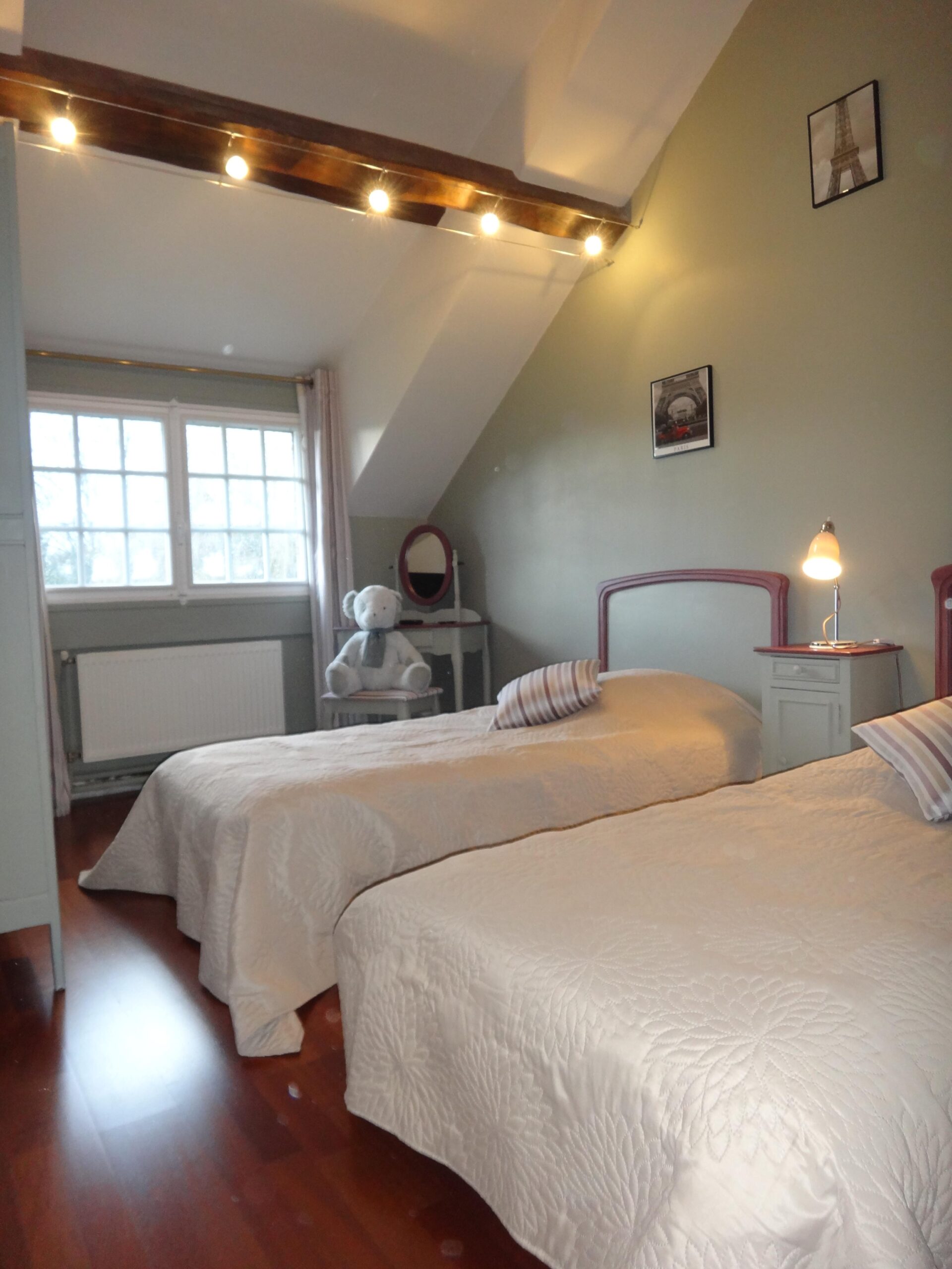 Suite Familiale "du Buisson", à l'étage. Une chambre avec lit matrimonial et une seconde avec deux lits de 90. Ces deux chambres partagent la même salle d'eau et sanitaires privatifs et mitoyens. Vues sur le jardin.