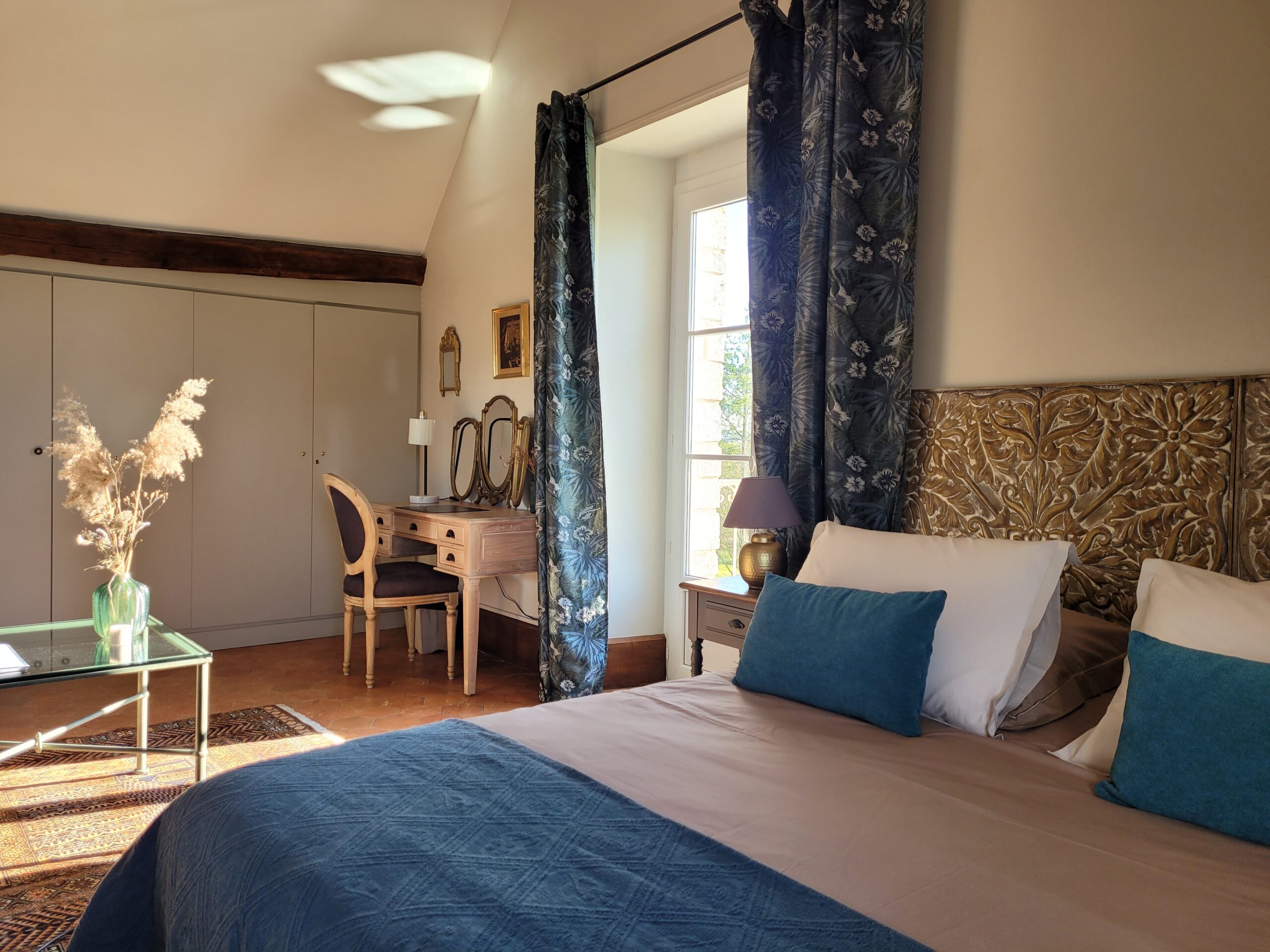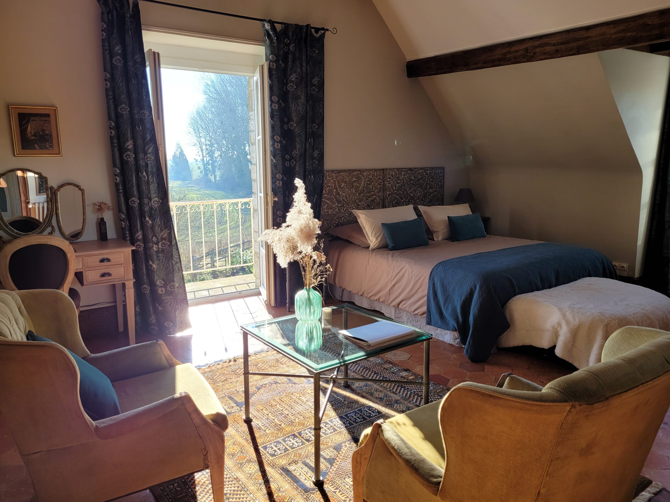 - Chambre Nymphéa (30m2) avec en option sa chambre communicante (+2 lits 1 personne). Belle chambre lumineuse de 30m2 avec son balcon bénéficiant d’une vue remarquable. Literie neuve de qualité queen size (160x200). Elle dispose d’un coin bureau ; d’une salle de bain privative séparée avec douche à l’italienne, baignoire, double vasque et wc. Selon les besoins d’accueil elle dispose d’une chambre de 14m2 communicante par la salle de bain pouvant accueillir 2 personnes supplémentaires.