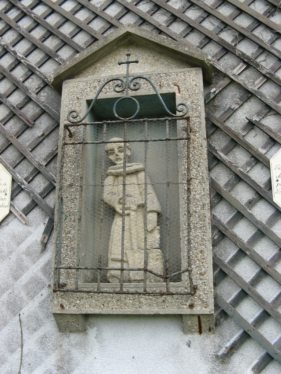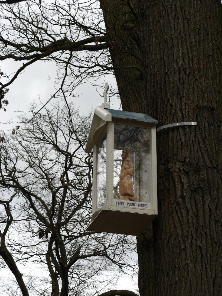 The oak at the Saint Joseph intersection houses a sacred niche. The patron saint of families is represented with a shepherd’s crook and a fleur-de-lys, the symbol of chastity and innocence. Continue on Route de Raucourt.