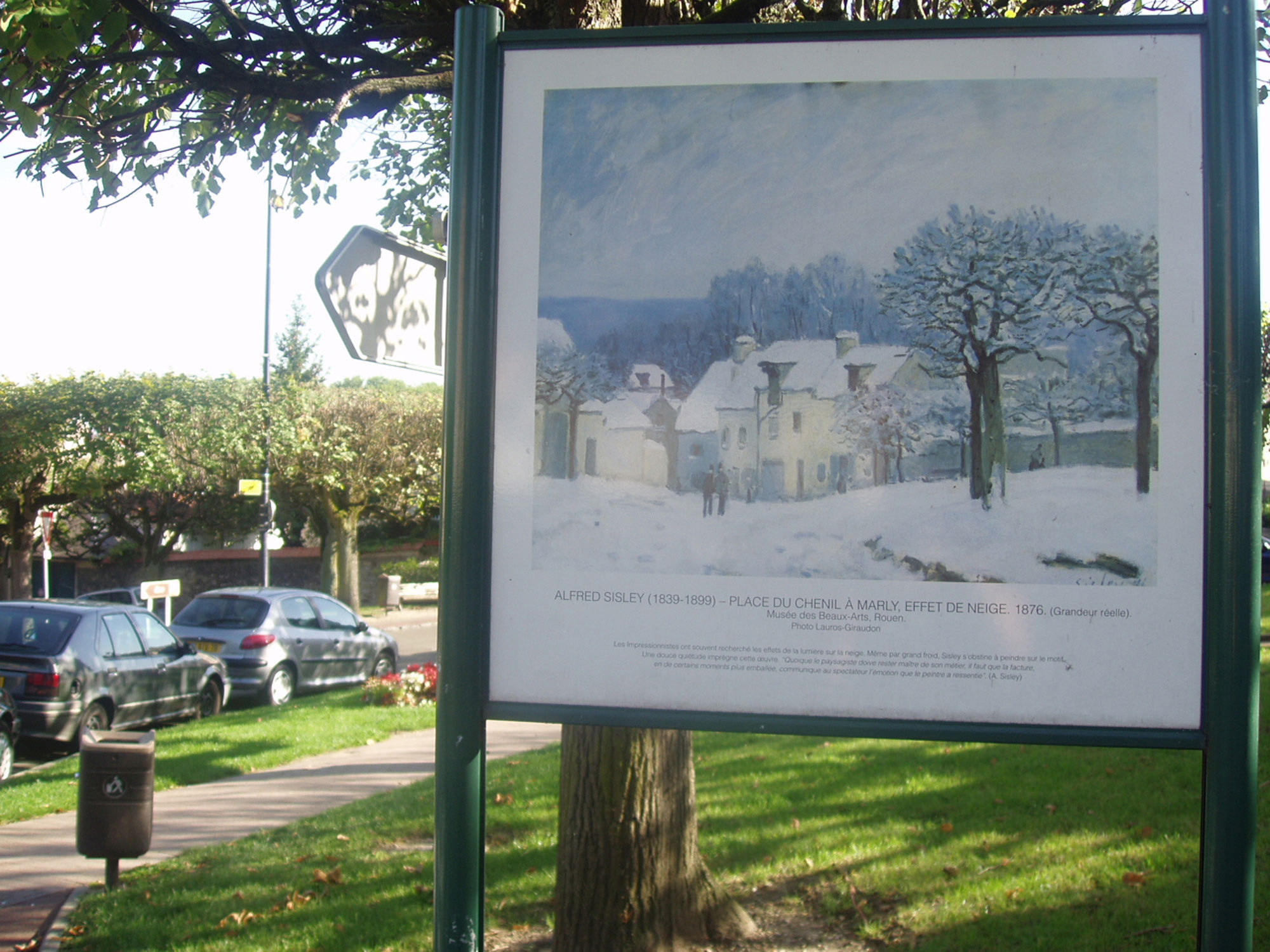 Part of this square was once occupied by the ancient cemetery of Marly le Bourg, previously surrounded by the Prieuré Saint Etienne, Notre Dame church and the Hôtel Dieu. It is lined with some old houses, one of which was a key establishment in French cuisine for many years: the Auberge du Vieux Marly, where owner André Guillot welcomed many famous people. Opposite the town hall, is an enamelled plate reproduction of a painting by Alfred Sisley, "Place du Chenil at Marley, snow effect". This reproduction is found on the "Chemin des Impressionnistes" which stretches across eight towns and villages in the Seine loop. Hôtel de Ville and Parc du Chenil. During his stays in Marly, Louis XIV spent a great deal of time hunting in the forest. After becoming Lord of Marly le Bourg in 1693, he established his kennels in the gardens of the former seigniorial dwelling, and the great hunter, Monsieur de la Rochefoucauld, stayed in the renovated dovecote. The current building has retained some of its 18th-century structure, including the overall framework and the mascarons of the façade. The municipality purchased the building in 1966 and it has housed the council offices since 1988.