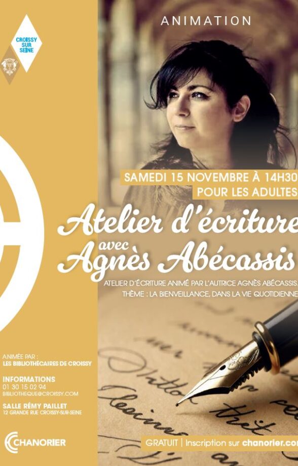 Un atelier d’écriture animé par Agnès Abécassis. Thème : La bienveillance dans la vie quotidienne Adulte à partir de 14 ans Rémy Paillet - Gratuit – Sur inscription Info et réservation : Bibliothèque 01.30.15.02.94 – bibliotheque@croissy.com