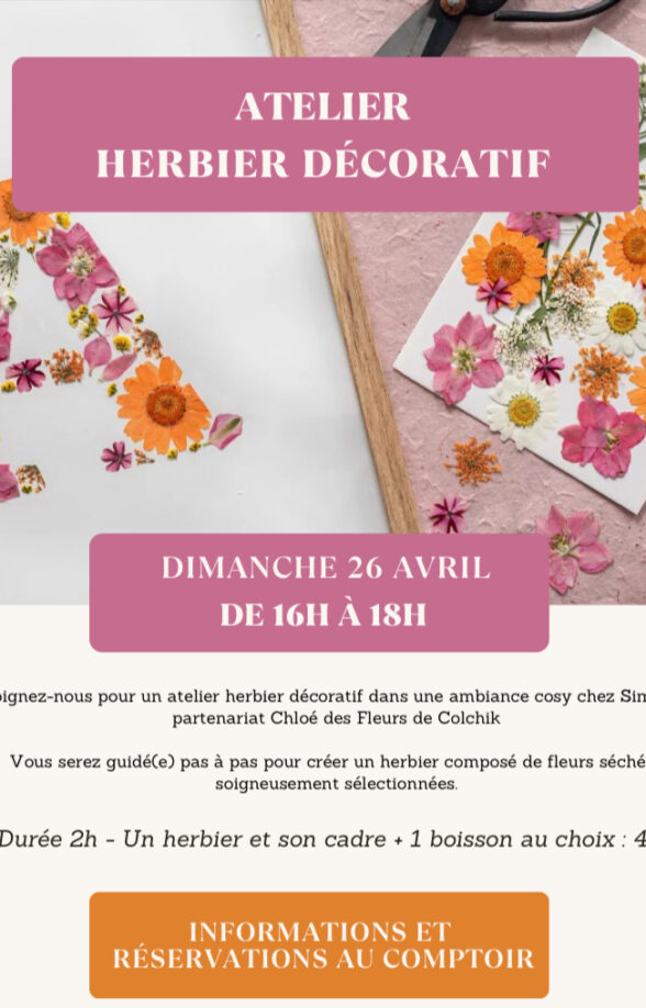 Rejoignez nous pour un après-midi créatif au Café Simone, vous serez guidé(e) par Chloé pour créer votre propre herbier en fleurs séchées. Une boisson est également incluse dans le prix de l’atelier.