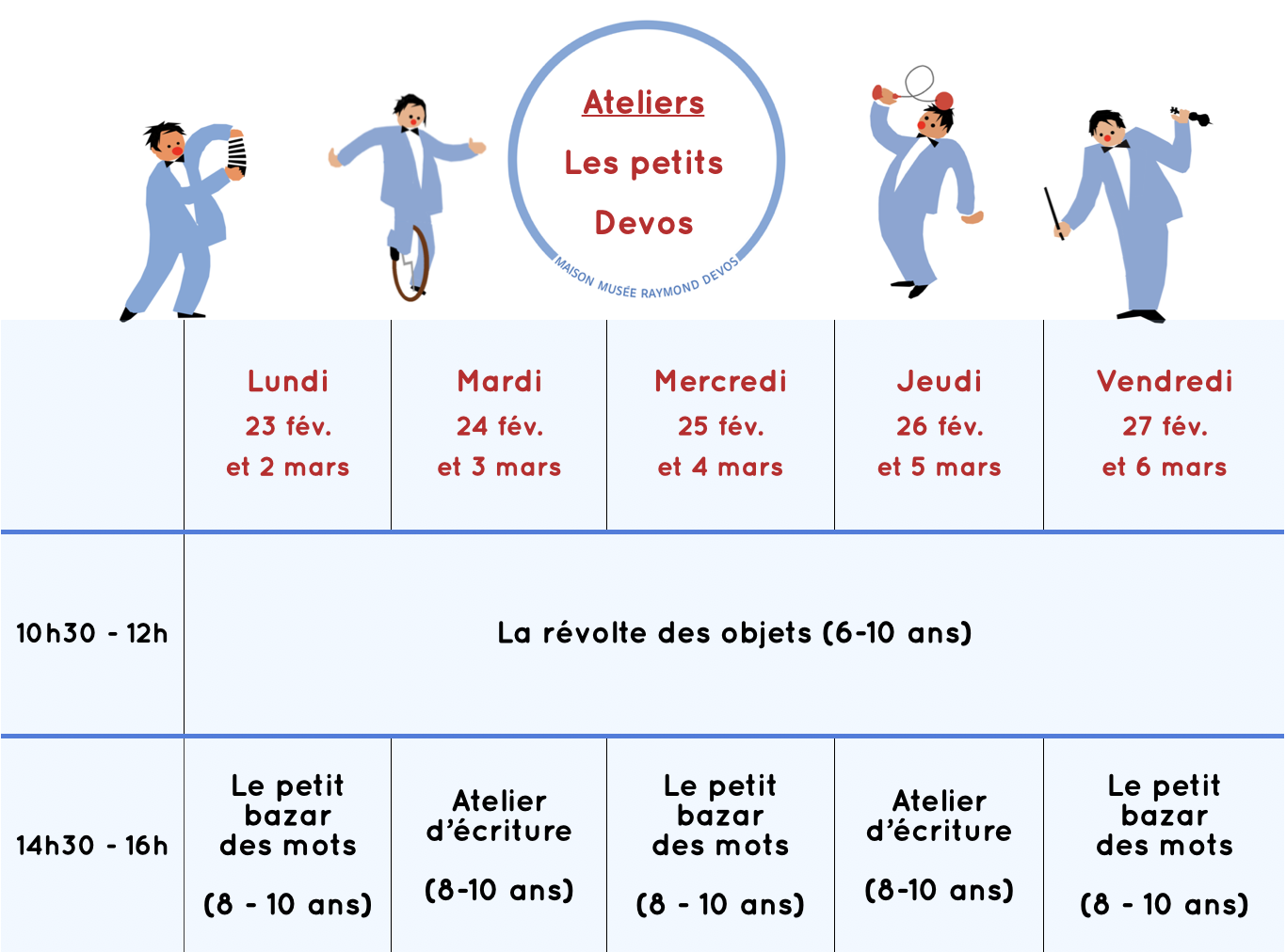 Pendant les vacances scolaires, la Maison-Musée Raymond Devos propose des ateliers ludiques et créatifs pour initier les enfants à l’univers poétique et à l’éveil de leur imaginaire.