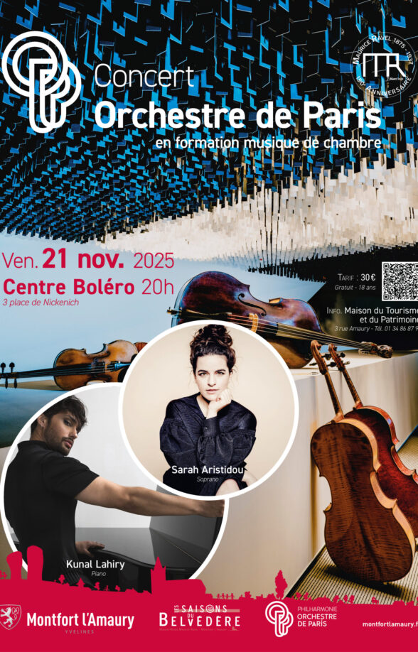 Pour clore l’année célébrant les 150 ans de la naissance de Maurice Ravel, la ville de Montfort-l’Amaury et la Philharmonie de Paris accomplissent leur partenariat à travers ce concert exceptionnel. Dans la ville où le compositeur vécut - au Belvédère - et où naquirent ses chefs-d’oeuvre les plus célèbres (Tzigane, L’Enfant et les Sortilèges, Boléro, les deux concertos pour piano…), les musiciens de l’Orchestre de Paris, en formation musique de chambre, retrouveront la soprano Sarah Aristidou et le pianiste Kunal Lahiry pour une soirée hommage aussi intime que prestigieuse sur le parquet du Centre Boléro.