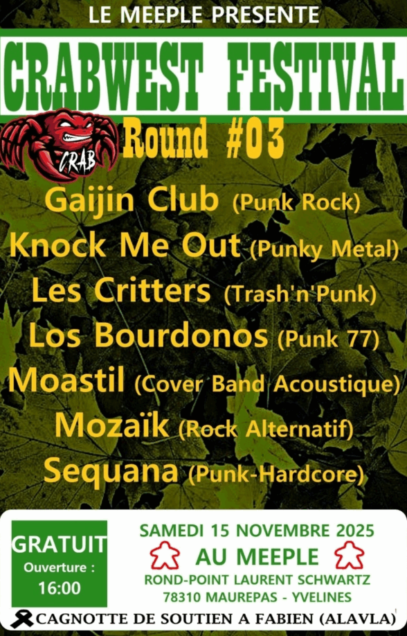 LE CRABWEST FESTIVAL EST DE RETOUR – ROUND #03 ! Le Collectif CRAB fait à nouveau trembler les murs du Meeple avec une soirée 100% PUNK / ROCK / METAL