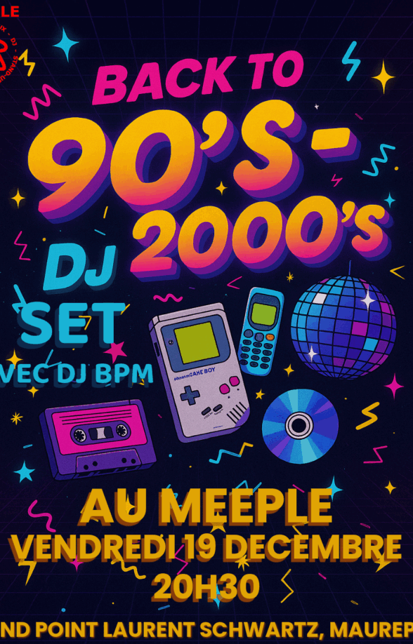 Ressors ton Nokia 3310, ton bandana et tes baskets à scratch : ce vendredi, on remonte le temps ! Le Meeple t’embarque pour une soirée 100% vibes des années 90 et 2000 !