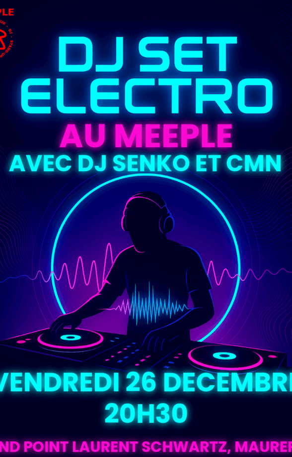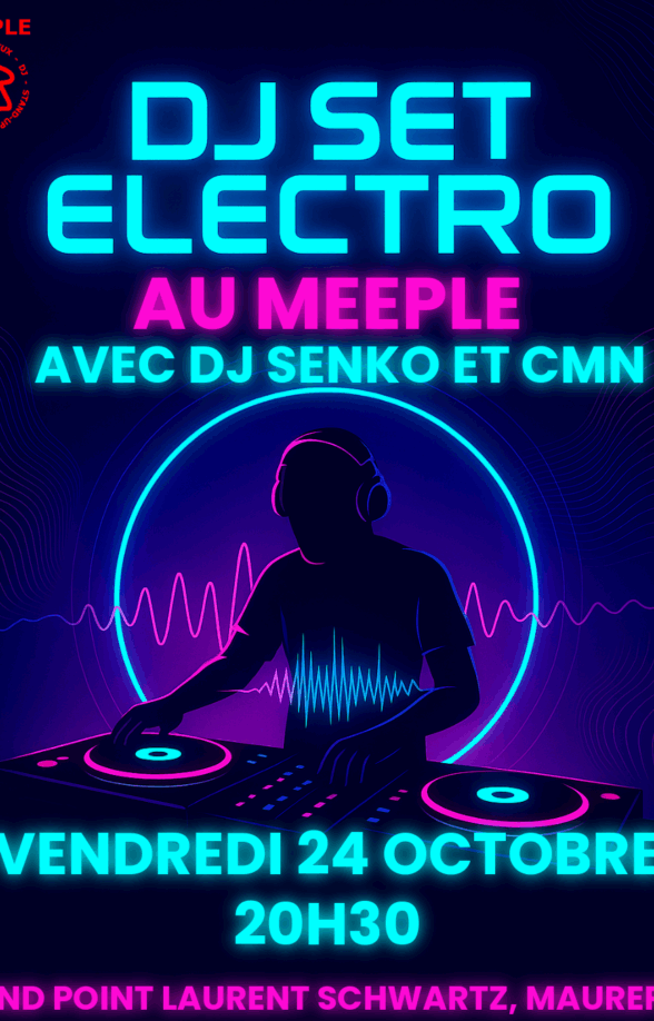 Prépare-toi à faire vibrer tes neurones (et tes baskets) ! Ce vendredi, le Meeple passe en mode électro pour une soirée sous haute tension ⚡