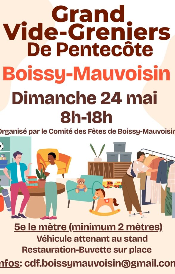 Pour y participer en tant qu'exposant, vous pouvez vous inscrire directement via notre boutique en ligne: https://www.helloasso.com/associations/comite-des-fetes-de-boissy-mauvoisin/boutiques/inscription-grand-vide-greniers-de-pentecote-de-boissy-mauvoisin
