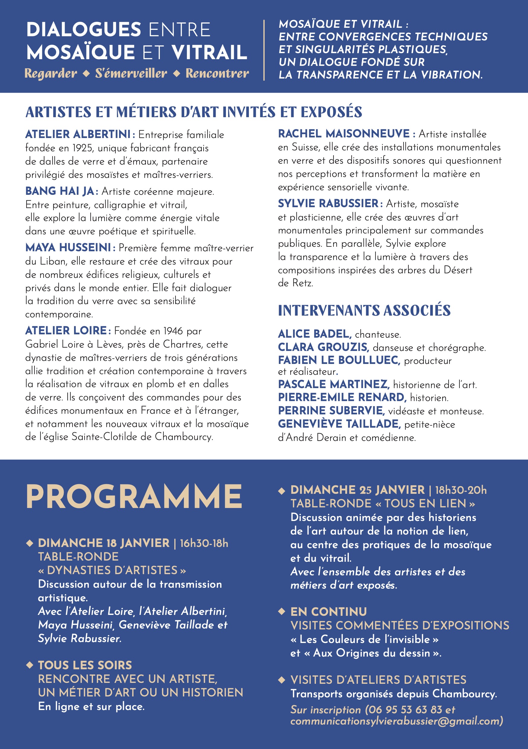 Les Journées de la mosaïque 2026 mettent en dialogue la mosaïque et le vitrail autour de deux expositions invitant des artistes et métiers d'art, des conférences, des tables-rondes et des visites d'ateliers d'artistes.