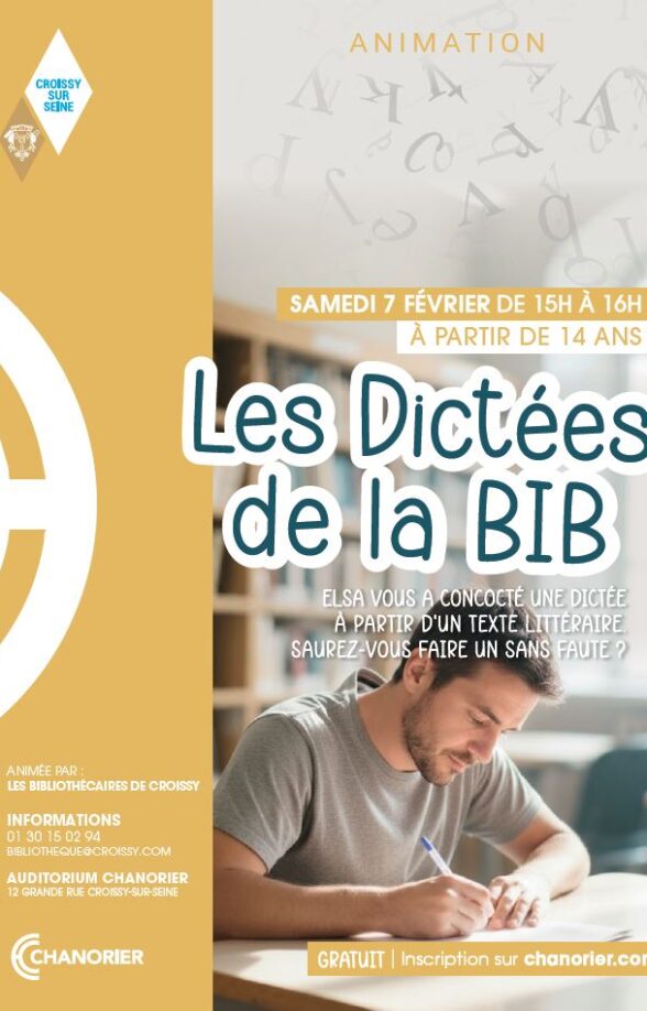 Elsa vous a concocté une dictée à partir d’un texte littéraire ! Saurez-vous faire un sans faute ? Adulte à partir de 14 ans Auditorium - Gratuit – Sur inscription Info Bibliothèque 01.30.15.02.94 ou bibliotheque@croissy.com