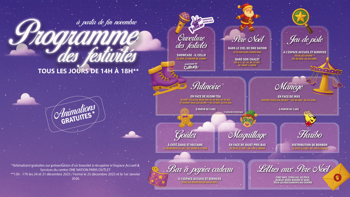 La magie de Noël s’installe à One Nation Paris ! Pâtinoire, manège, arrivée du Père Noël et bien d’autres surprises : un programme d’animations complet vous attend pour célébrer les fêtes en famille. ✨