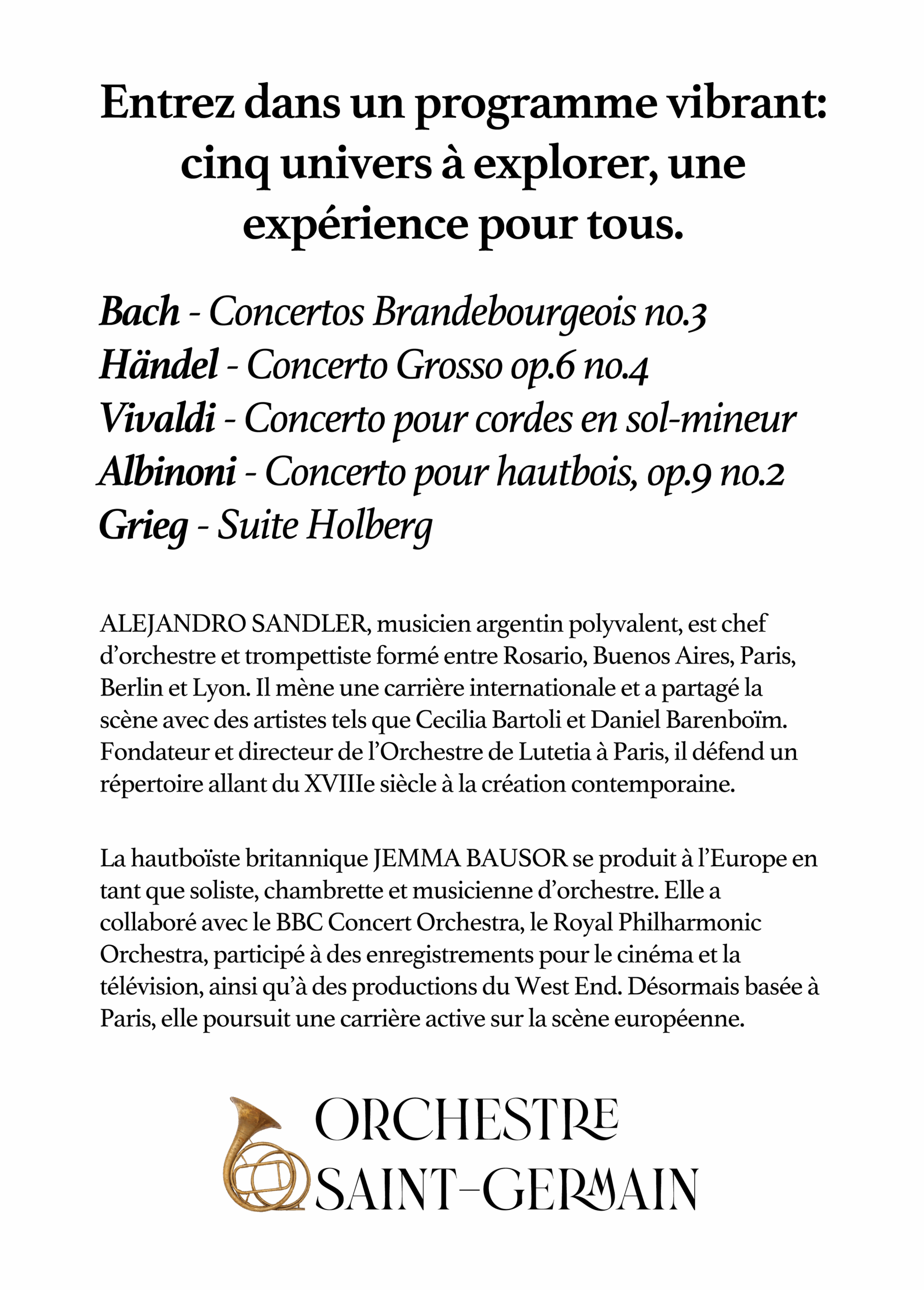 Le concert, placé sous la direction d’Alejandro Sandler, s’ouvre avec des chefs-d’œuvre de Johann Sebastian Bach, Antonio Vivaldi et Georg Friedrich Händel. Ces œuvres sont mises en regard avec la Suite Holberg d’Edvard Grieg, une pièce néo-baroque construite comme une suite de danses françaises du baroque, mais enrichie des couleurs et de l’expressivité du XIXᵉ siècle.
