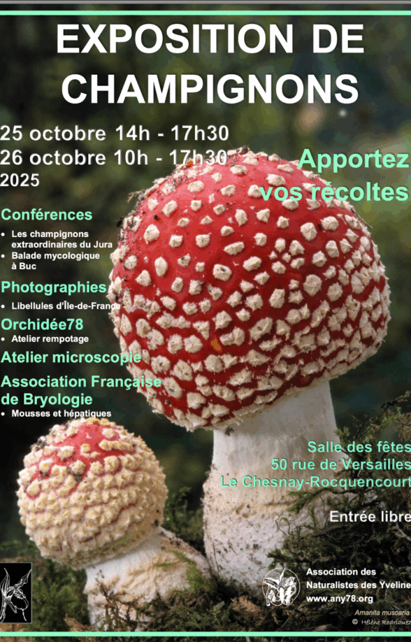 Exposition de champignons présentée par l'ANY Association des Naturalistes des Yvelines et séance dédicace de l'autrice illustratrice Anita Berdugo à l'occasion de la sortie de son nouveau livre pour les enfants sur les champignons: exposition de champignons de photos, de peintures, conférences, ateliers, dédicace