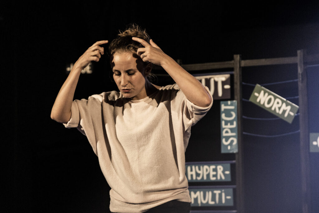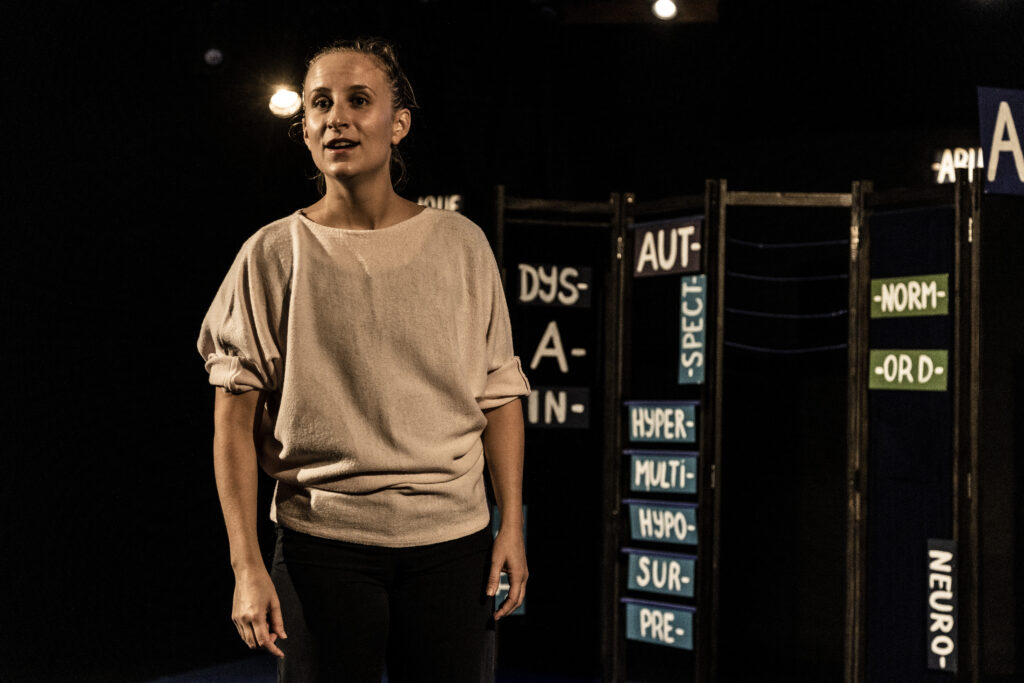 Quels mots utiliser pour dire la différence ? Jouant avec le code de l’exposé pour toute suite le faire dérailler, Atypiques questionne la puissance paradoxale du langage : nommer mais aussi assigner. Décrire et soulager, mais aussi enfermer. La comédienne déplie un paravent aux allures de malle aux trésors et revient aux racines de termes qui nous paraissent pourtant évidents, transparents. Normal. Ordinaire. Autiste. Autre. Typique. Extraordinaire. À la dérive autour des mots et de leur sens se noue ainsi une parole plus intime, entre témoignage et confession, sur l’expérience de l’autisme au sein d’une fratrie et sur la pression sociale de la normativité. Un spectacle sensible et poétique, ludique et interactif.