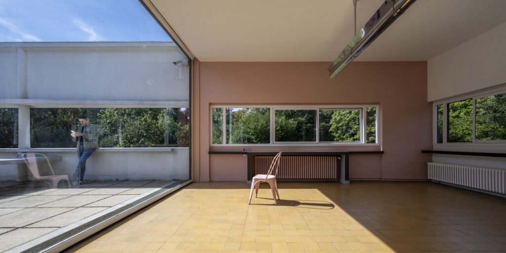 Derrière sa façade géométrique immaculée, la Villa Savoye se révèle étonnamment colorée. La lumière glisse sur les murs peints et chaque fenêtre s’ouvre sur la nature environnante. Construite par Le Corbusier entre 1928 et 1931, elle incarne pleinement ce que l’architecte appelait les Heures Claires : une expérience intime et lumineuse.