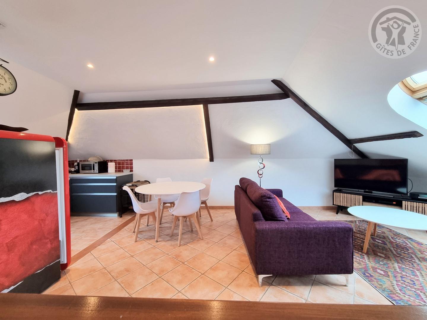 Entrée sur la cuisine équipée (réfrigérateur, four, micro-ondes, lave-vaisselle, plaque gaz 4 feux) et espace repas. Séjour mansardé, poutres en bois apparentes, lumineux, avec de grandes ouvertures par les vélux. TV 80cm.