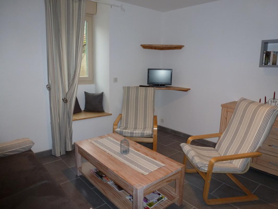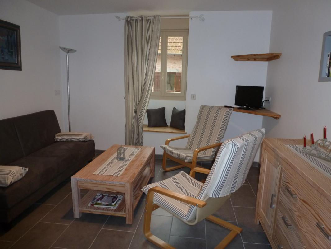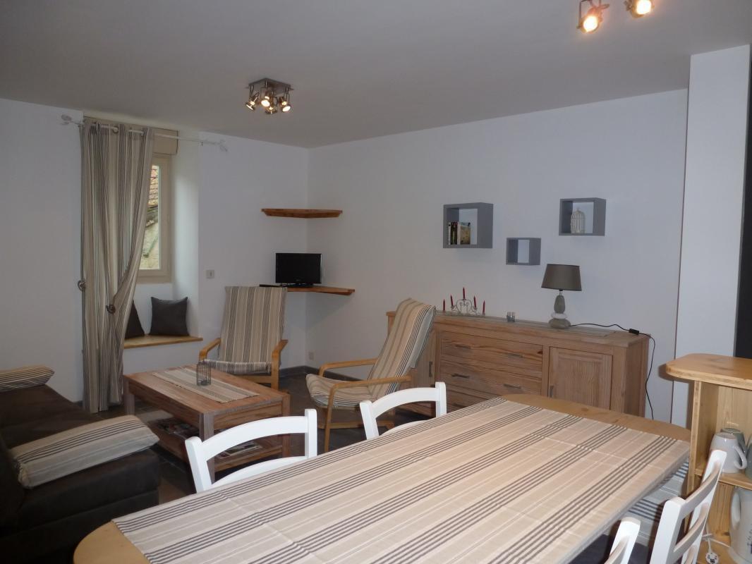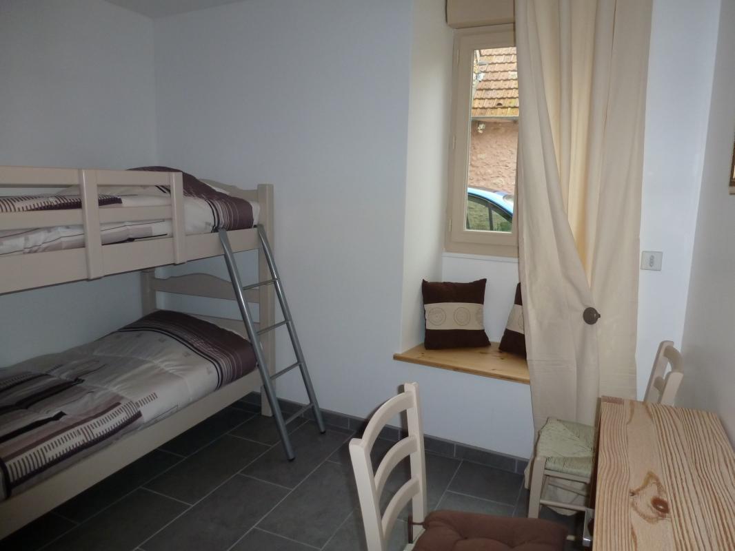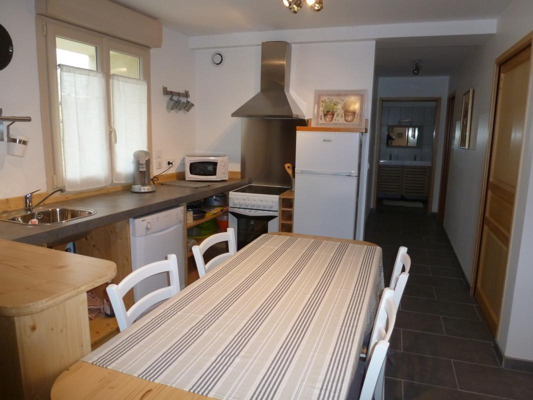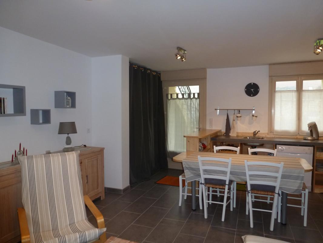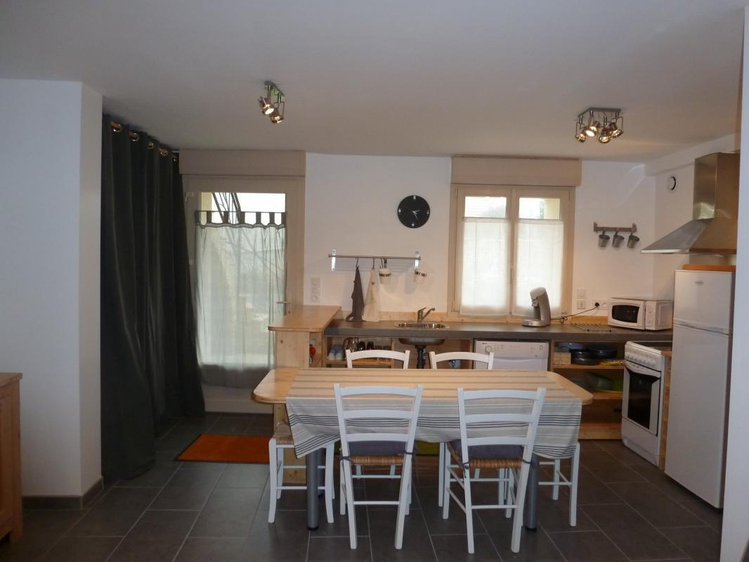 Gîte de 63 m², au rez-de-chaussée de plain-pied, accessible aux personnes à mobilité réduite : cuisine ouverte, salon avec canapé-lit 1 pers. (en dépannage), 1 chambre (2 lits 90), 1 chambre (2 lits 90 superposés dissociables), salle d'eau à l'italienne avec WC. Terrasse commune, salon de jardin, barbecue, parking intérieur privatif.