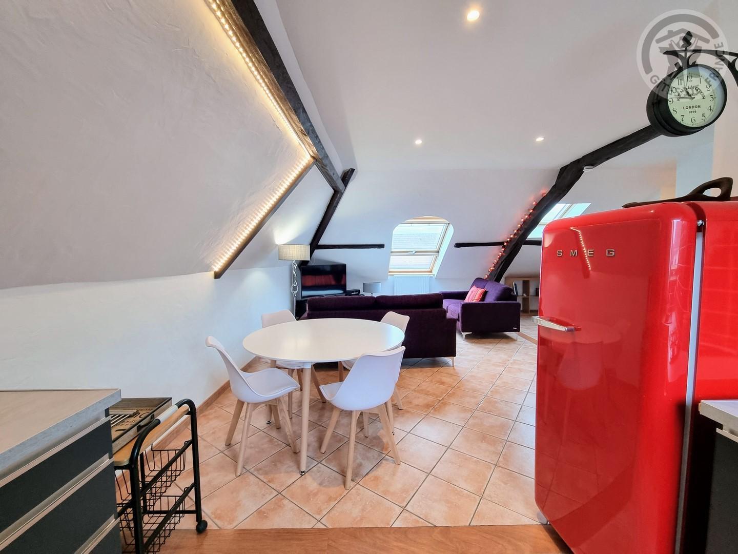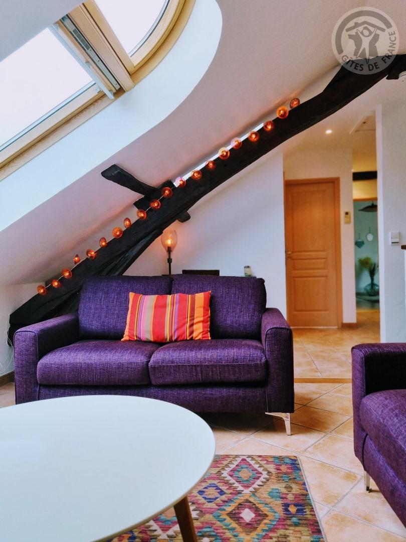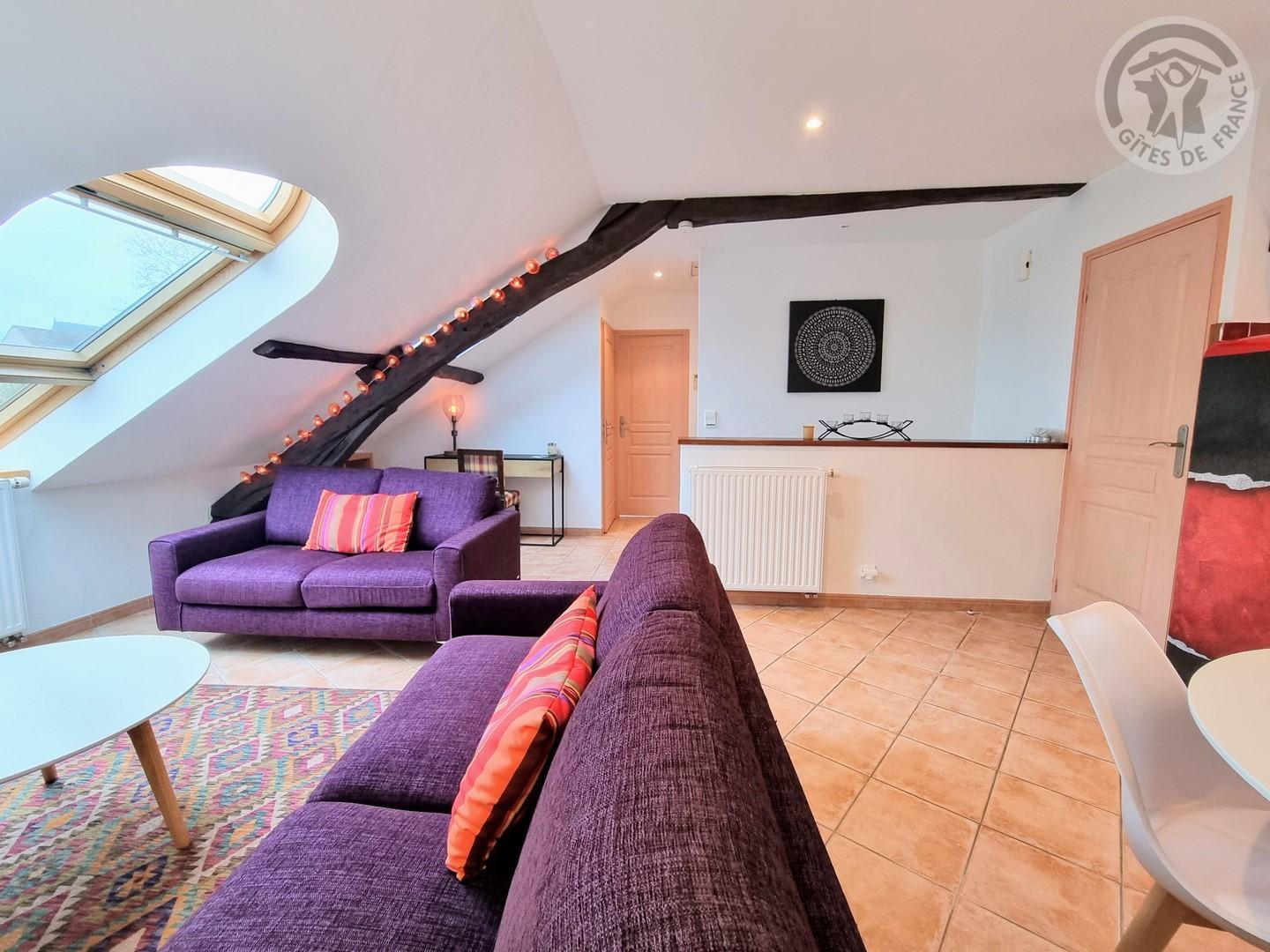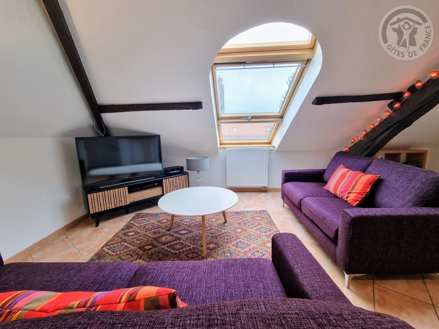 Séjour mansardé, poutres en bois apparentes, lumineux, avec de grandes ouvertures par les vélux. TV 80cm.