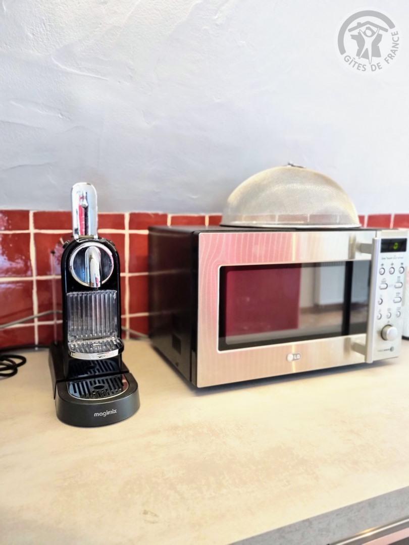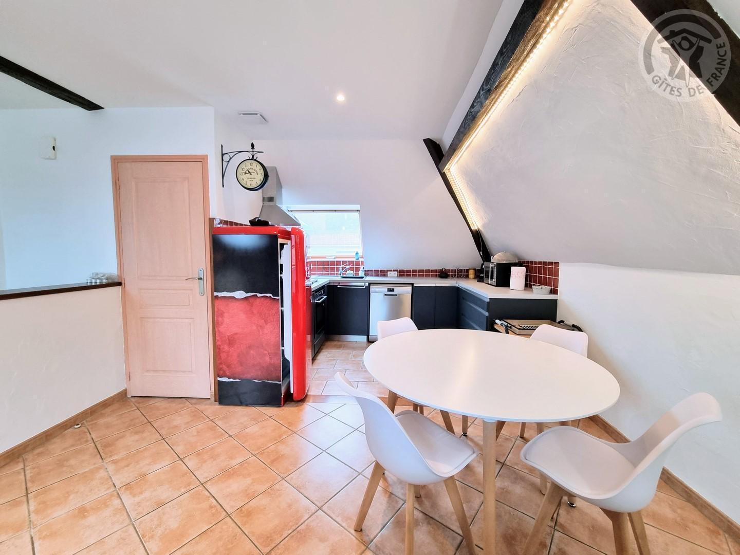 Entrée sur la cuisine équipée (réfrigérateur, four, micro-ondes, lave-vaisselle, plaque gaz 4 feux) et espace repas.