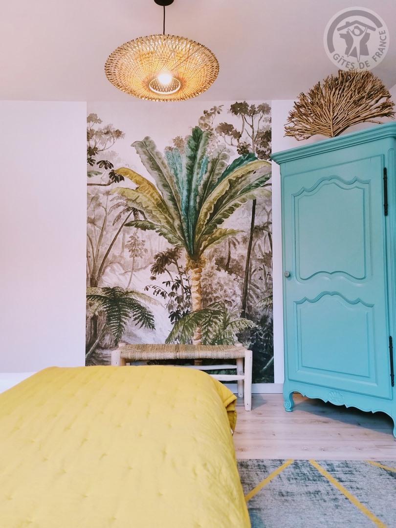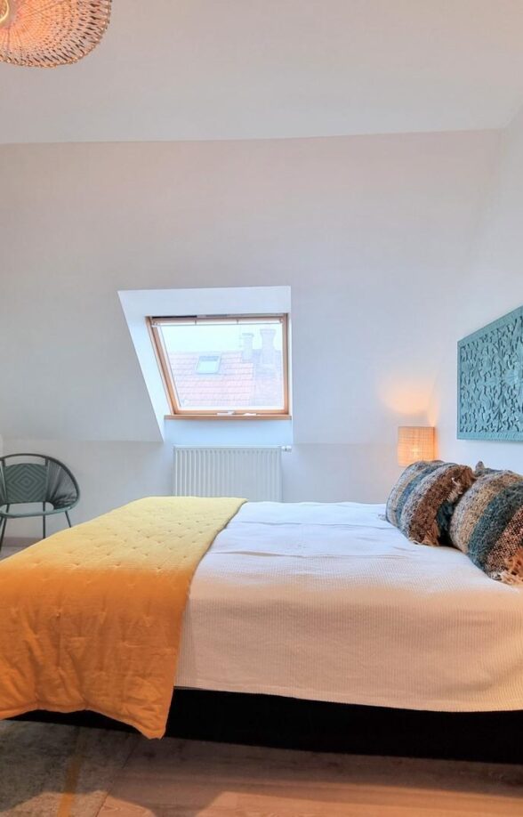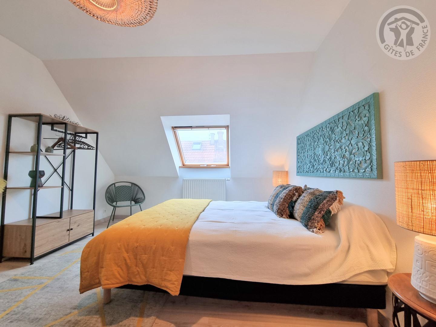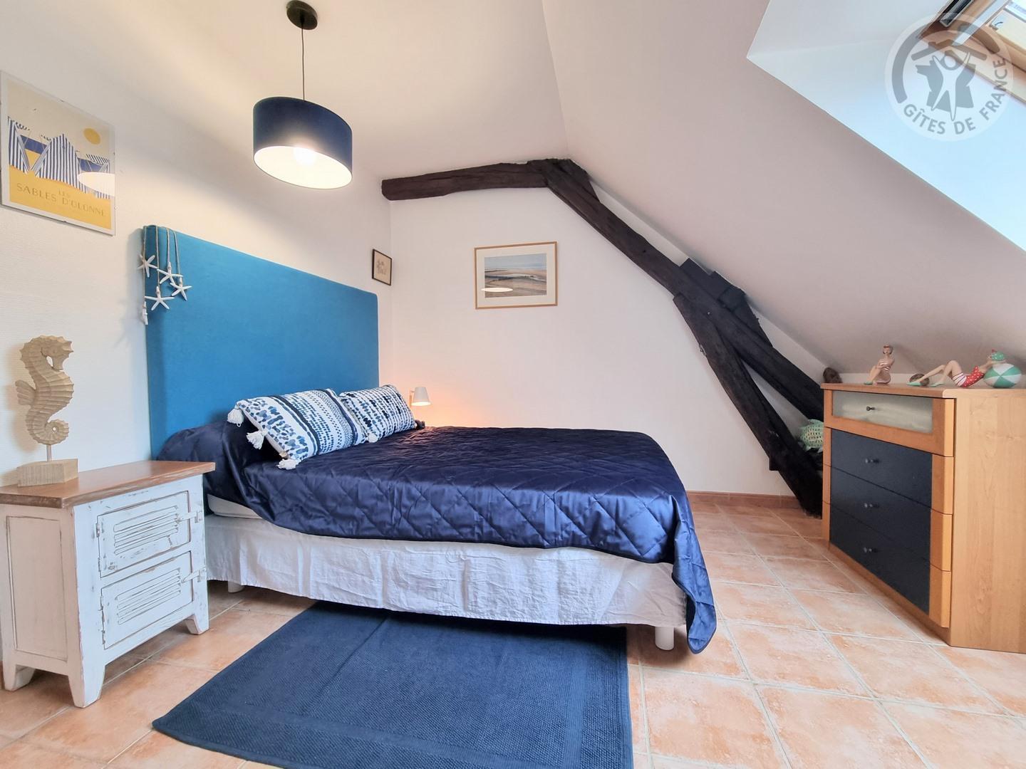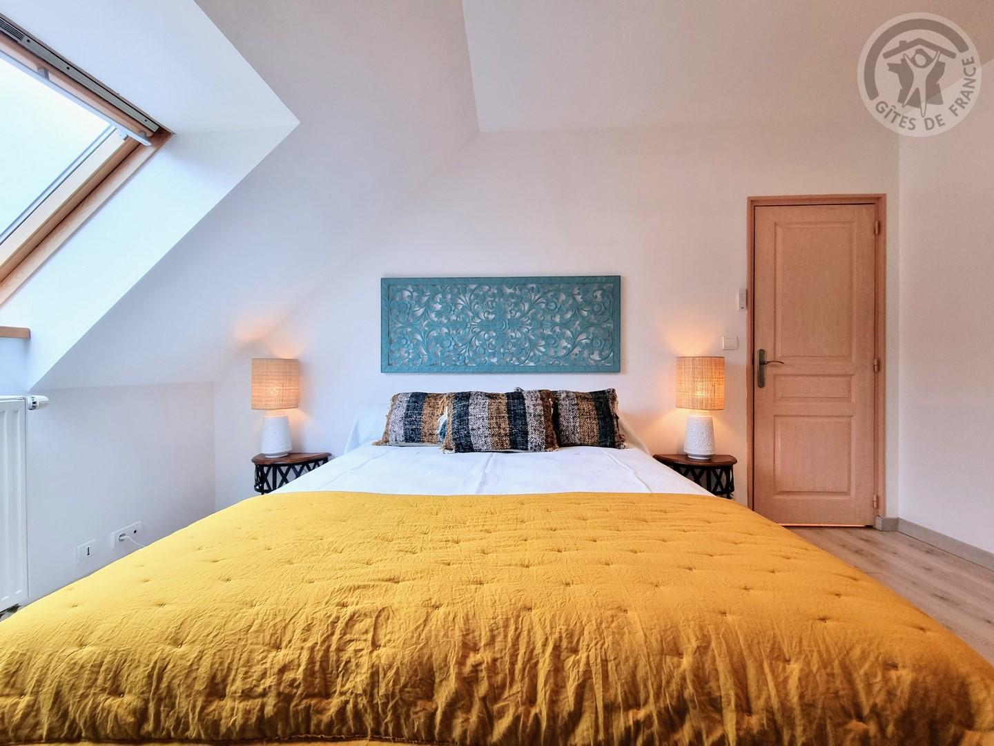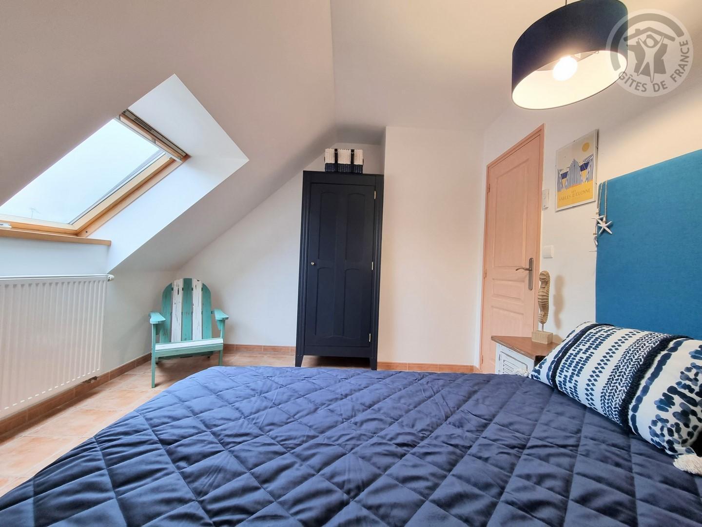 Une chambre mansardée avec un lit 140x190cm.