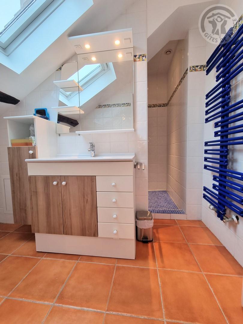 Une salle d'eau avec douche120x170cm en sous-pente, vasque et lave-linge. WC.