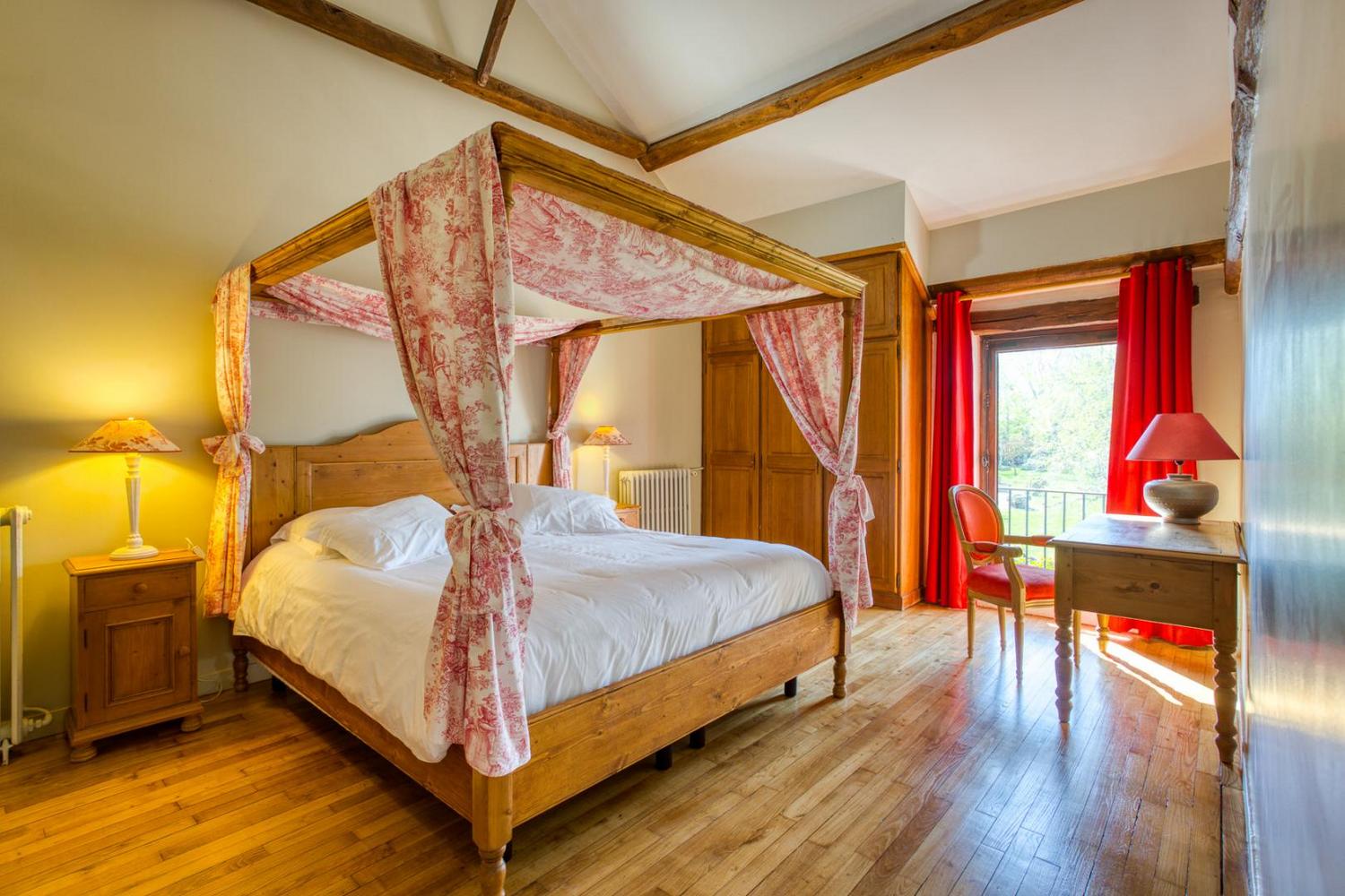 Une chambre avec un lit double baldaquin 180x200cm. Lit et chaise bébé à disposition.