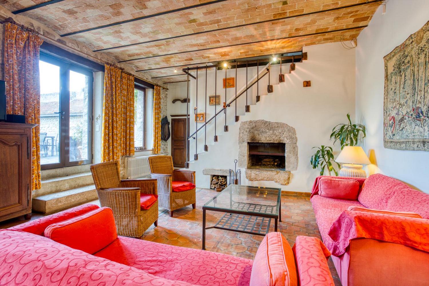 Rez-de-chaussée : séjour avec canapés, cheminée à insert (bois non fourni), TV 110cm et WIFI (fibre optique).