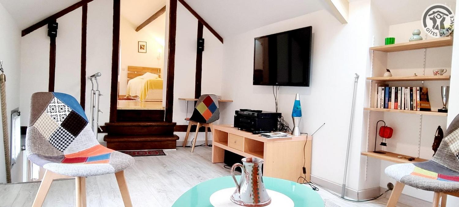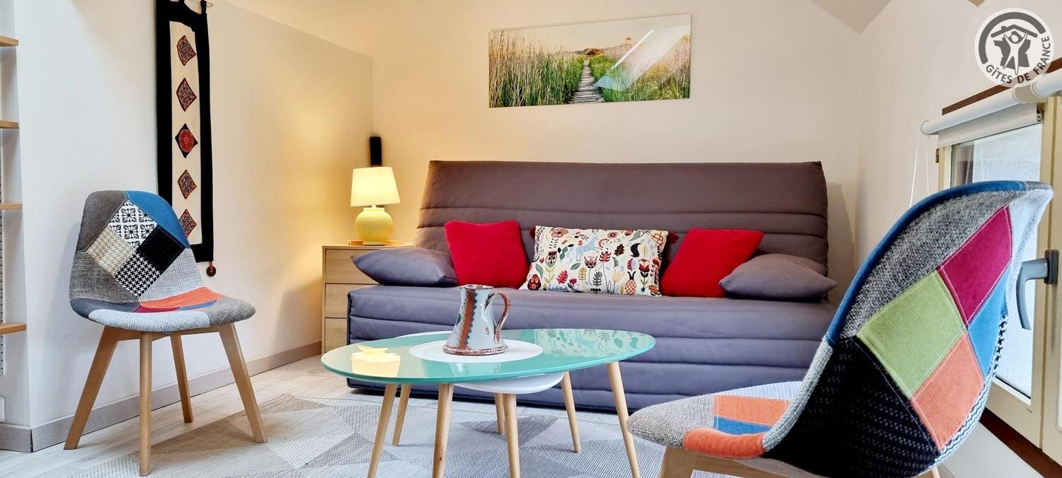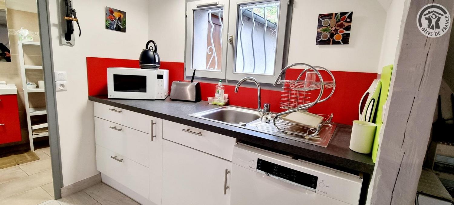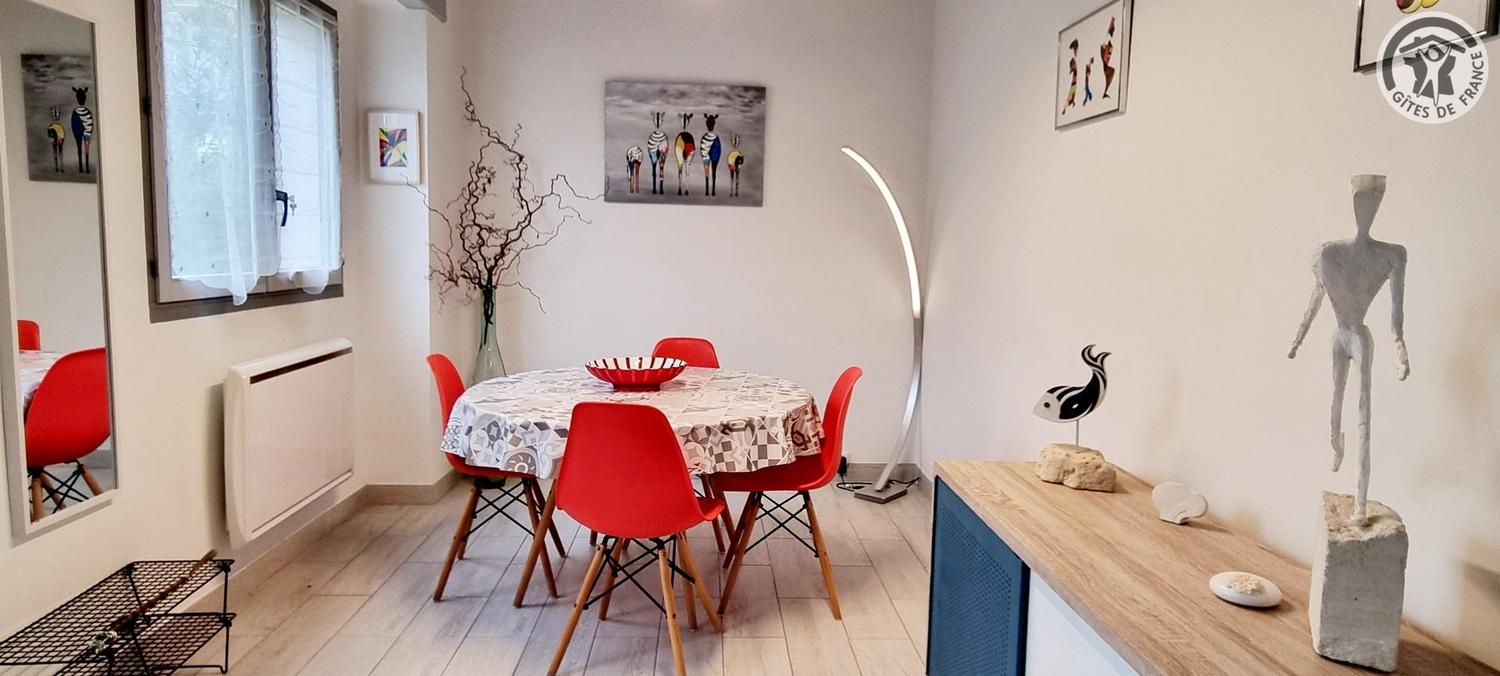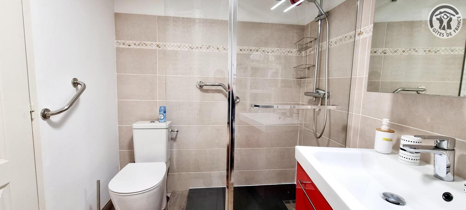 Au rez-de-chaussée : cuisine équipée (four, micro-ondes, cafetière à filtre et cafetière à capsules, lave-linge, lave-vaisselle, plaque 3 feux induction), accessible par une marche. Séjour avec espace repas, TV 55 cm. Salle d'eau avec douche italienne 0,80 x 1,20 m, WC avec barre d'appui.