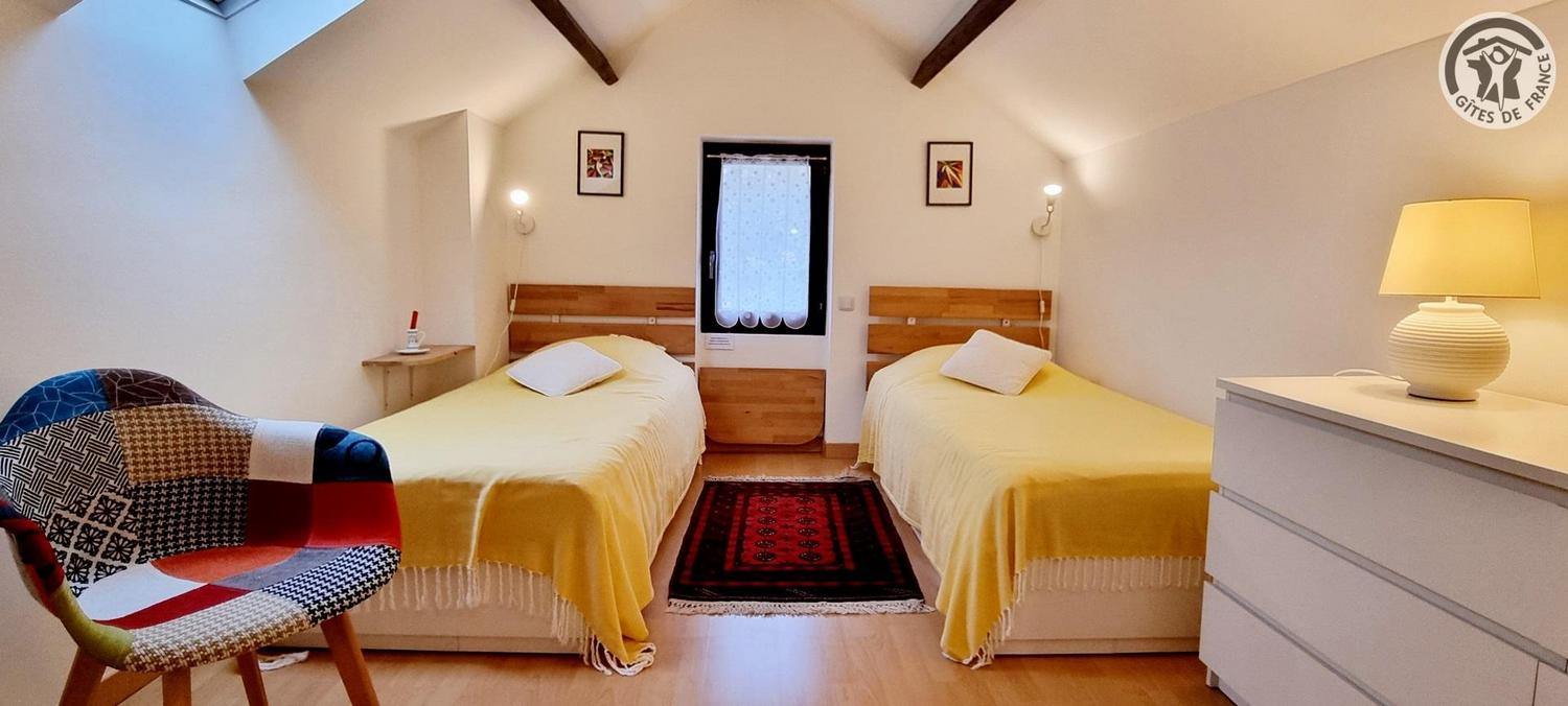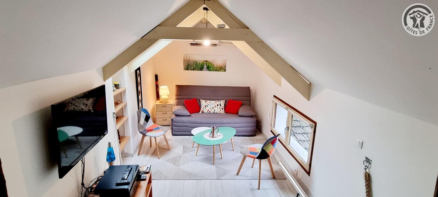 À l'étage, accès par un escalier étroit avec double rampes en corde. Chambre mansardée avec deux lits 90 x 200 cm (possibilité de les réunir en un lit 180 x 200 cm). Coin salon avec canapé convertible 140 x 190 cm (pour un adulte ou deux enfants), TV 106 cm, home cinéma, chaîne hi-fi, coin bureau.