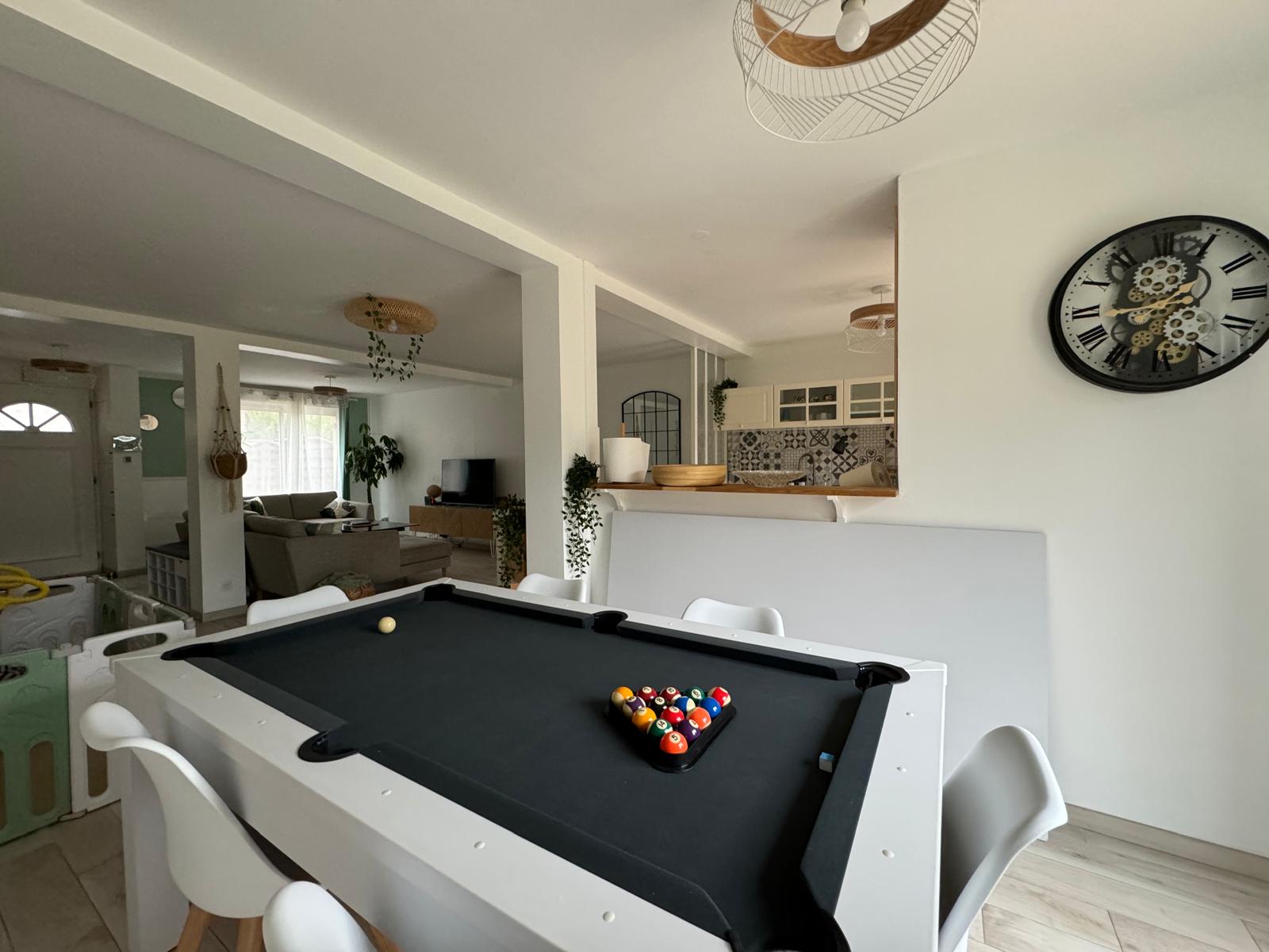 - Au rez-de-chaussée : belle pièce de vie de 50m² avec cuisine ouverte équipée, salle à manger avec billard table convertible, espace tv, coin lecture, espace enfant et WC.