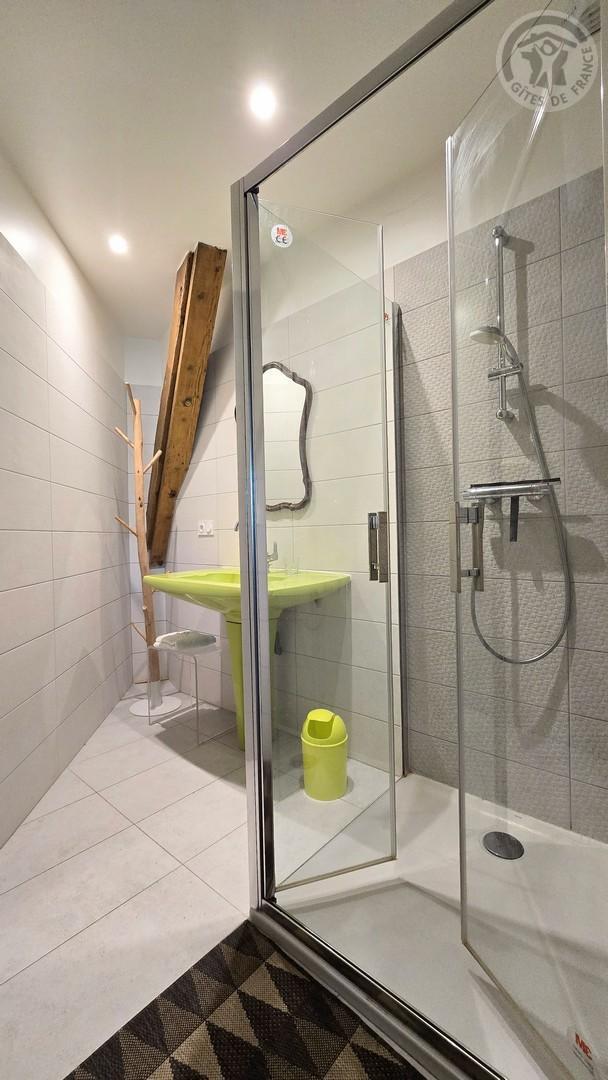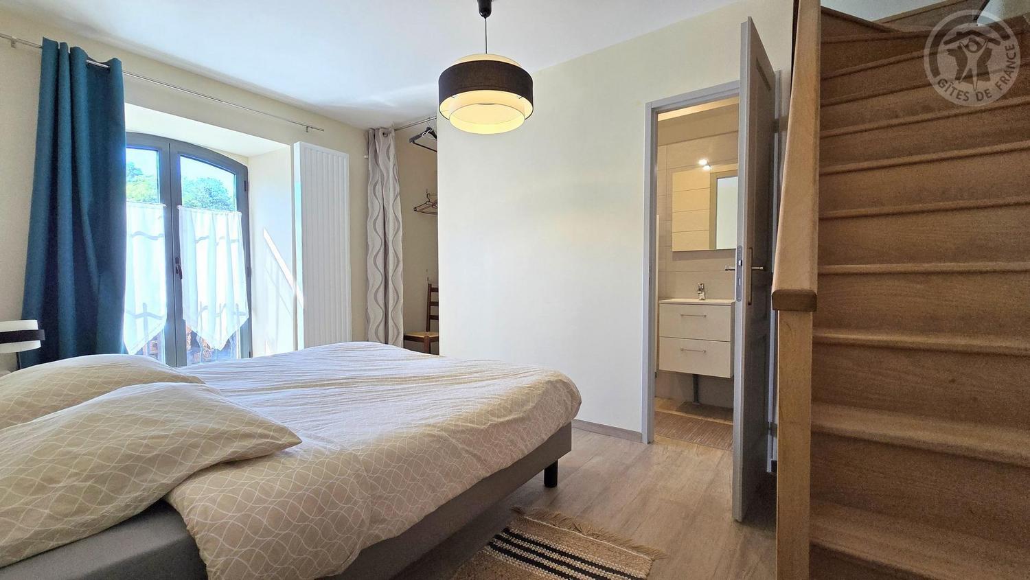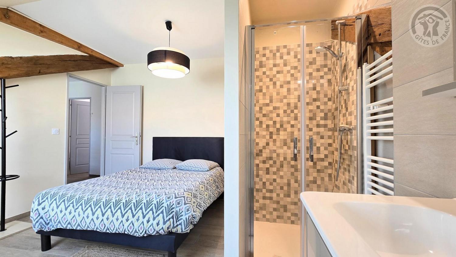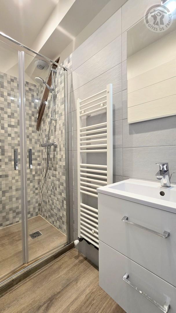 Une chambre avec 1 lit 140x190cm et 1 lit 90x190cm. Salle d'eau vasque et douche (85x85). WC indépendant avec lave-linge et sèche-linge.