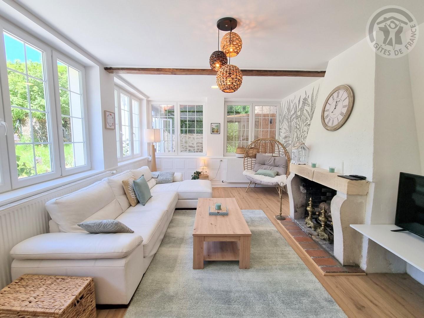 Séjour convivial avec cheminée feu de bois foyer ouvert (première flambée offerte, le reste est à la charge du locataire), canapé ,TV 100cm (Amazon prime, Netflix et Youtube, pas de chaînes classiques) . WC.