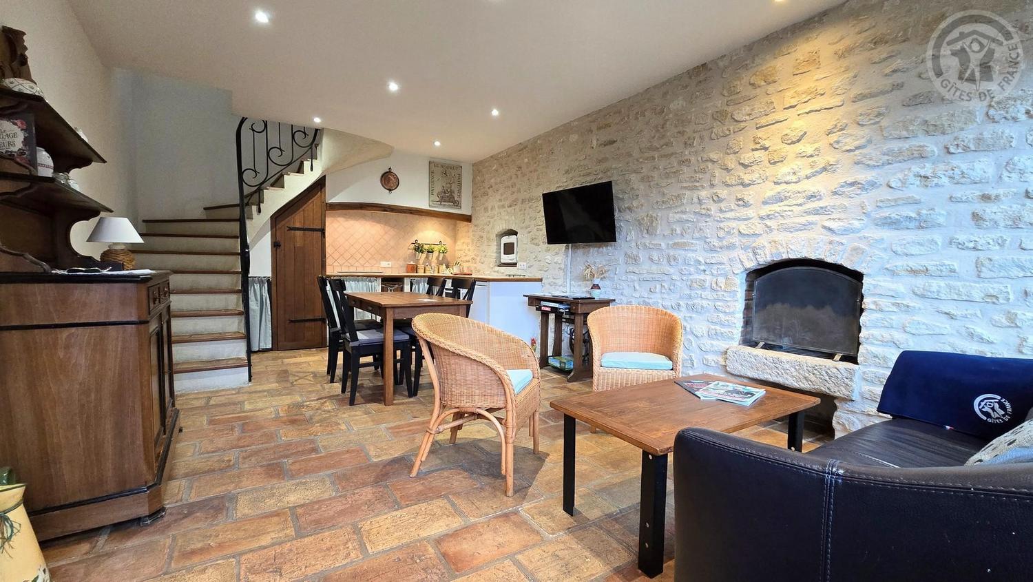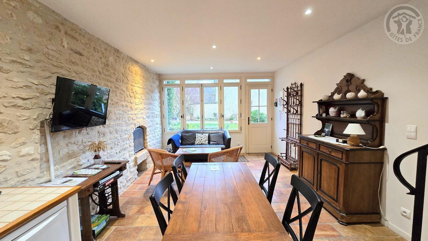Rez-de-chaussée : séjour avec coin repas, cheminée décorative, TV 103cm et WIFI (fibre optique).