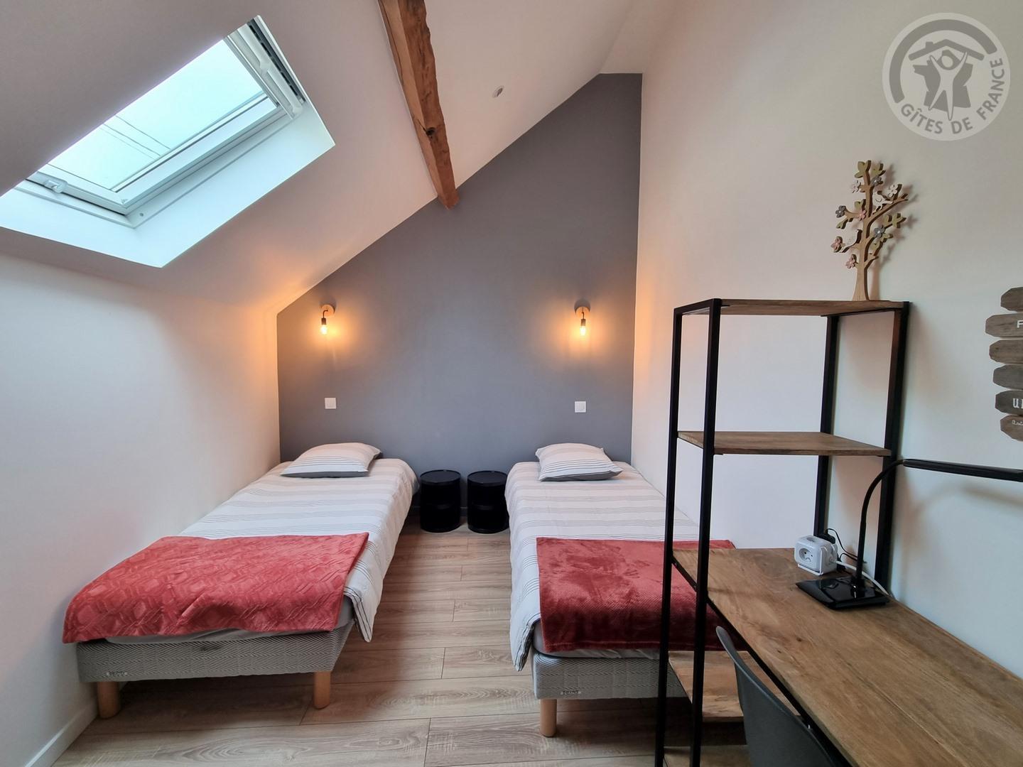 Accès aux deux chambres (par quelques marches), chacune aménagées avec deux lits simples 90X200cm jumelables sur demande, TV.