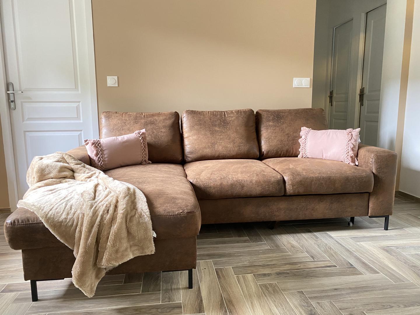 Entrée sur une belle pièce de vie avec canapé d'angle et TV écran plat 120cm. Cuisine ouverte et équipée avec frigo-congélateur, 4 plaques vitro, four à chaleur tournante, micro-ondes, lave-vaisselle, cafetière Nespresso.