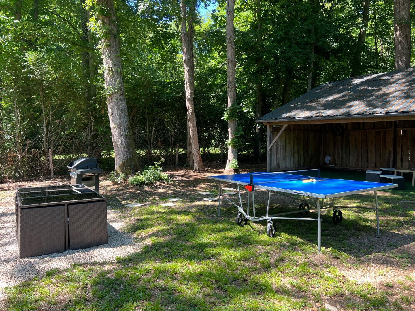 Stationnement privatif et sécurisé par un portail pour 2 véhicules. Jardin privatif et clos sans vis à vis de 500m², au cœur d'un bois avec sa terrasse, salon de jardin, barbecue, table de ping-pong