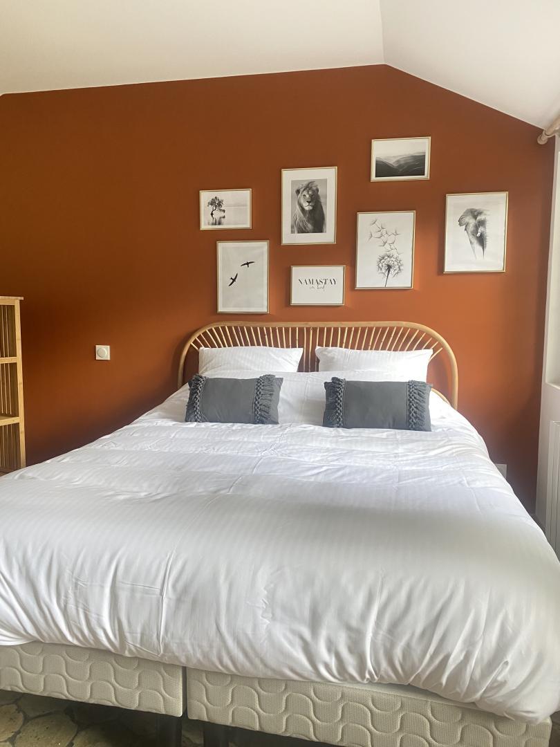 Une suite parentale avec 1 lit 160x190, TV écran plat 80cm, bureau pour télétravail, salle d'eau privative avec douche cabine 90x90, vasque et WC, lave-linge séchant. Matériel bébé à disposition.