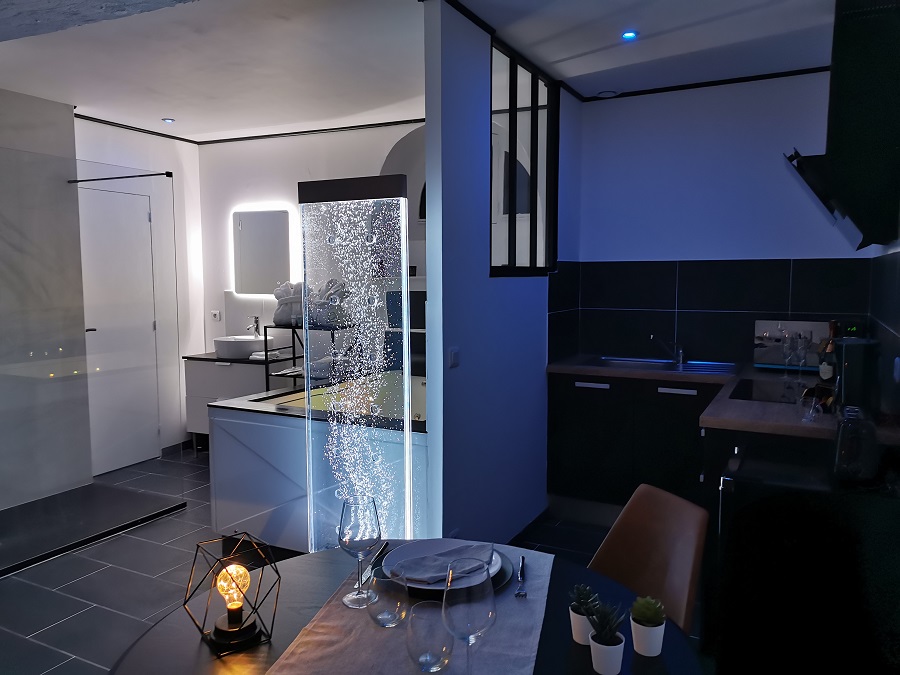 L'Appartement L'Envol : En duplex, il propose une grande chambre et un espace salon avec cheminée à l'étage. Détendez-vous au coin du feu, blottissez-vous dans un fauteuil rond XXL, ou profitez d'un écran plat de 138 cm. Le ciel étoilé, spécialement conçu pour une nuit romantique, sublimera votre séjour.