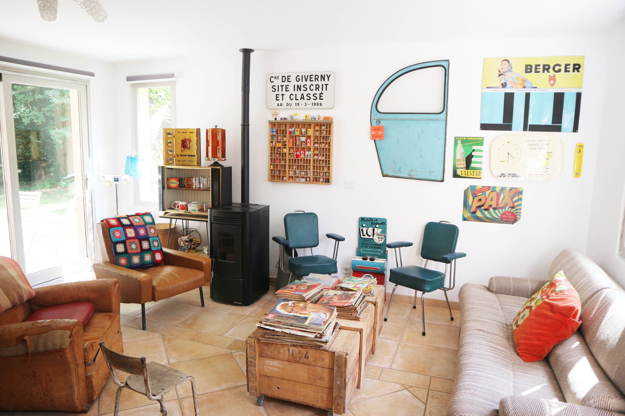 A deux pas de Giverny et au coeur des Boucles de Seine, maison atypique entièrement décorée façon "vintage" ! Nichée dans un parc boisé avec piscine.