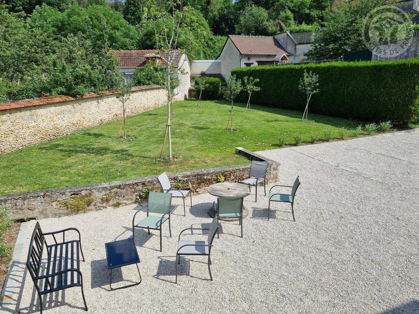 Portail automatique, terrasse, jardin commun clos avec mobilier extérieur et barbecue.