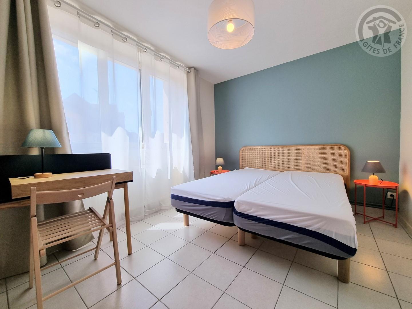 Chambre avec deux lits individuels 80x200 (possibilité un lit double 160x200cm), une armoire et un bureau.