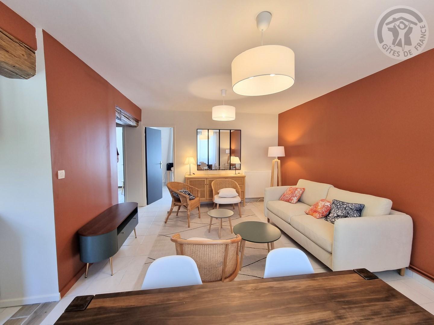 Entrée sur le séjour avec un canapé convertible 140x190cm, TV 100cm et WIFI (fibre optique).