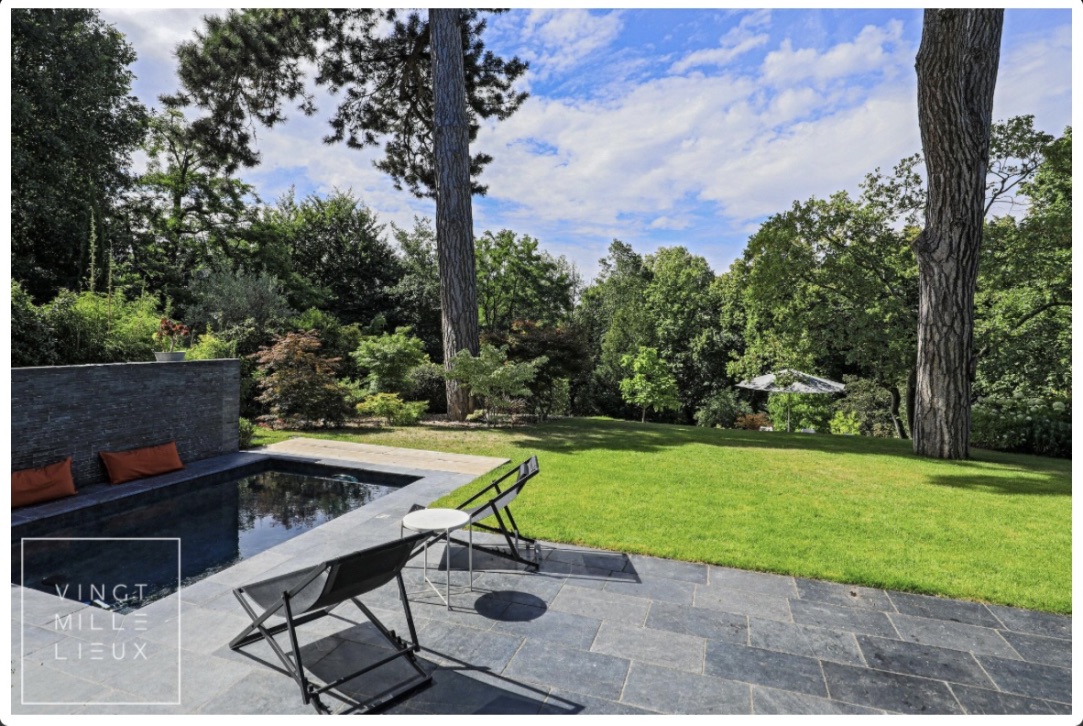 Le vaste jardin de 1000 m² avec ses majestueux pins et sa piscine offre un cadre idéal pour se détendre en pleine nature, tout en restant proche des commodités.