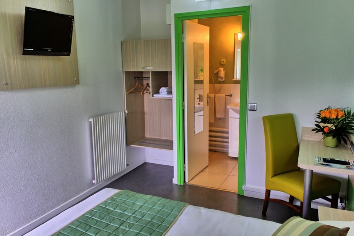 Toutes nos chambres, situées au rez-de-chaussée, offrent un accès direct à notre jardin intérieur arboré. Profitez d'un confort absolu avec un équipement complet : écran plat de 81 cm (CANAL+, beIN Sports, 15 chaînes européennes), salle de bain privée avec douche et sèche-cheveux.