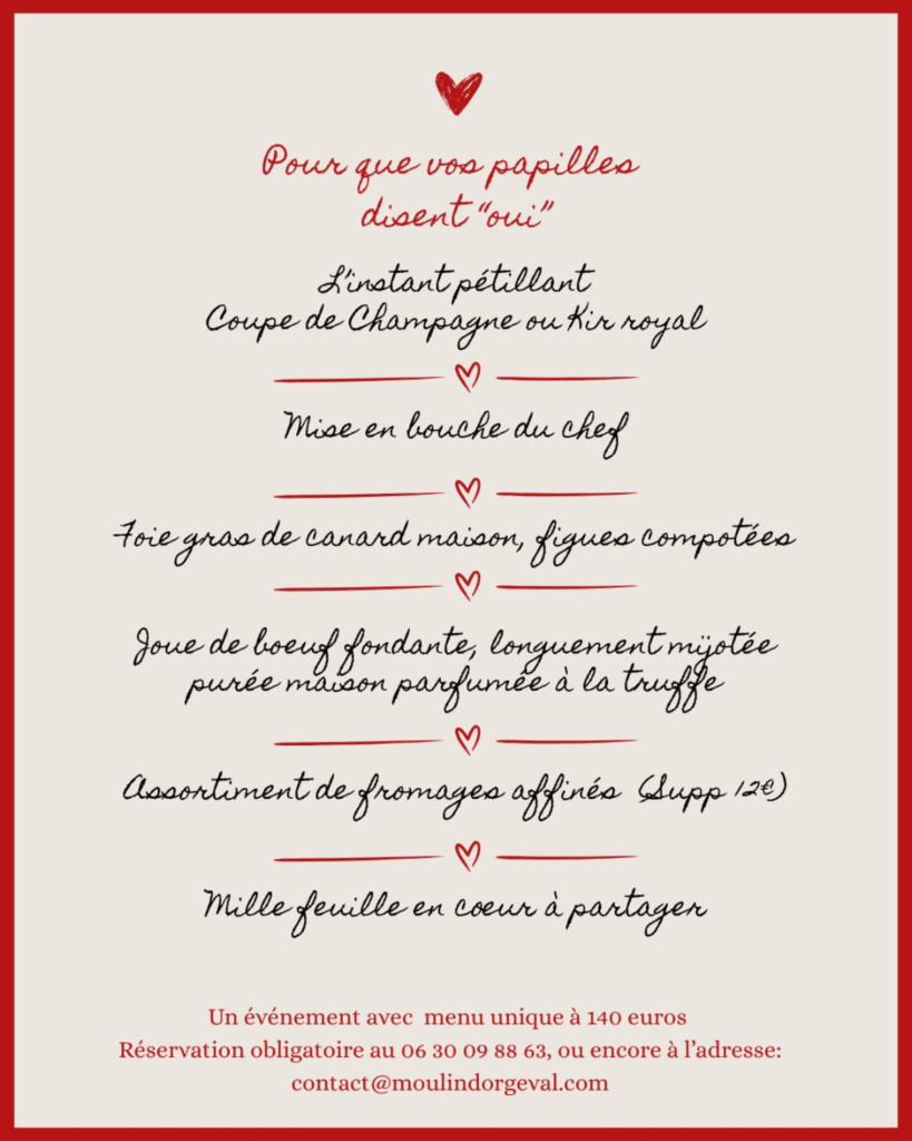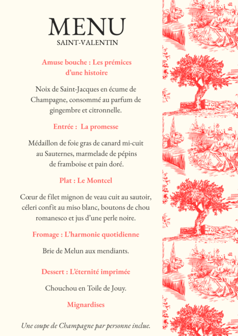 Un menu d’exception dans un endroit d’exception avec une personne exceptionnelle : voici en quelques mots votre soirée de Saint-Valentin chez Cazaudehore. Un menu en 5 temps à déguster avec une bouteille de champagne à partager.