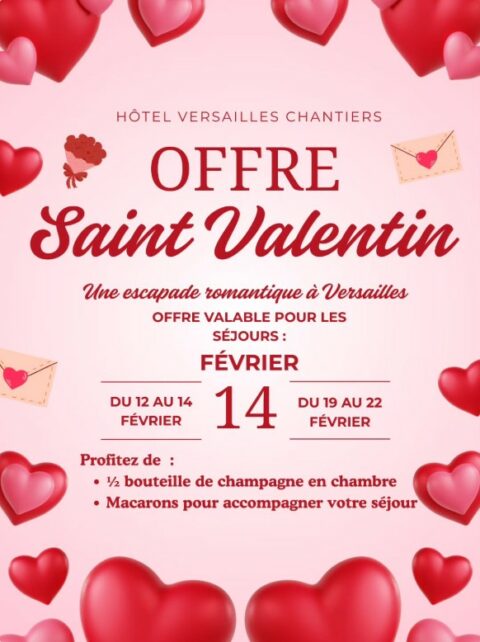 Offrez-vous une escapade romantique à deux à l’Hôtel Versailles Chantiers et célébrez la Saint-Valentin dans une atmosphère élégante et chaleureuse.